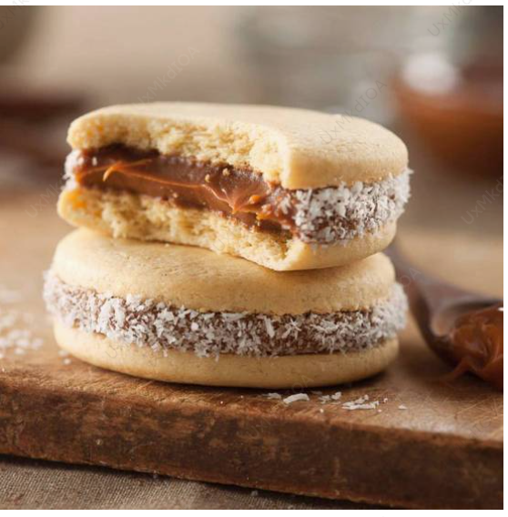 Galleta típica de Argentina rellena de dulce de leche con coco alrededor.