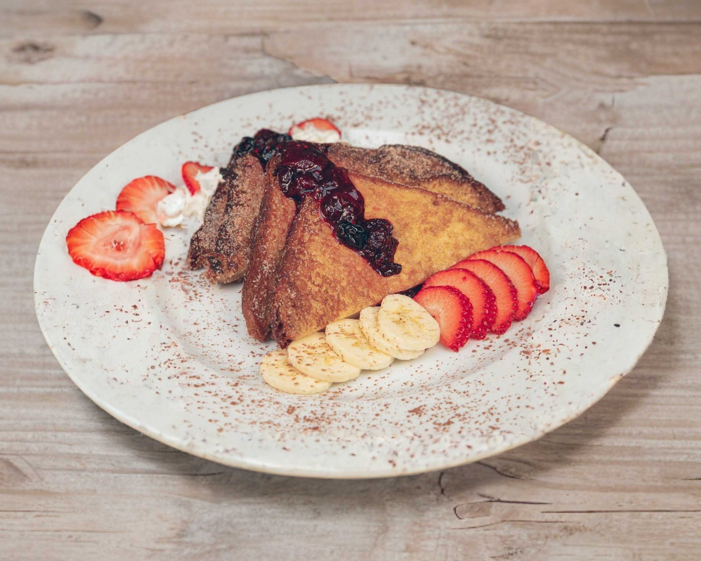 Pan brioche artesanal hecho en casa preparado al estilo francés, espolvoreado con azúcar, canela, acompañado de plátano, fresa y compota de frutos rojos con dulce a elección.