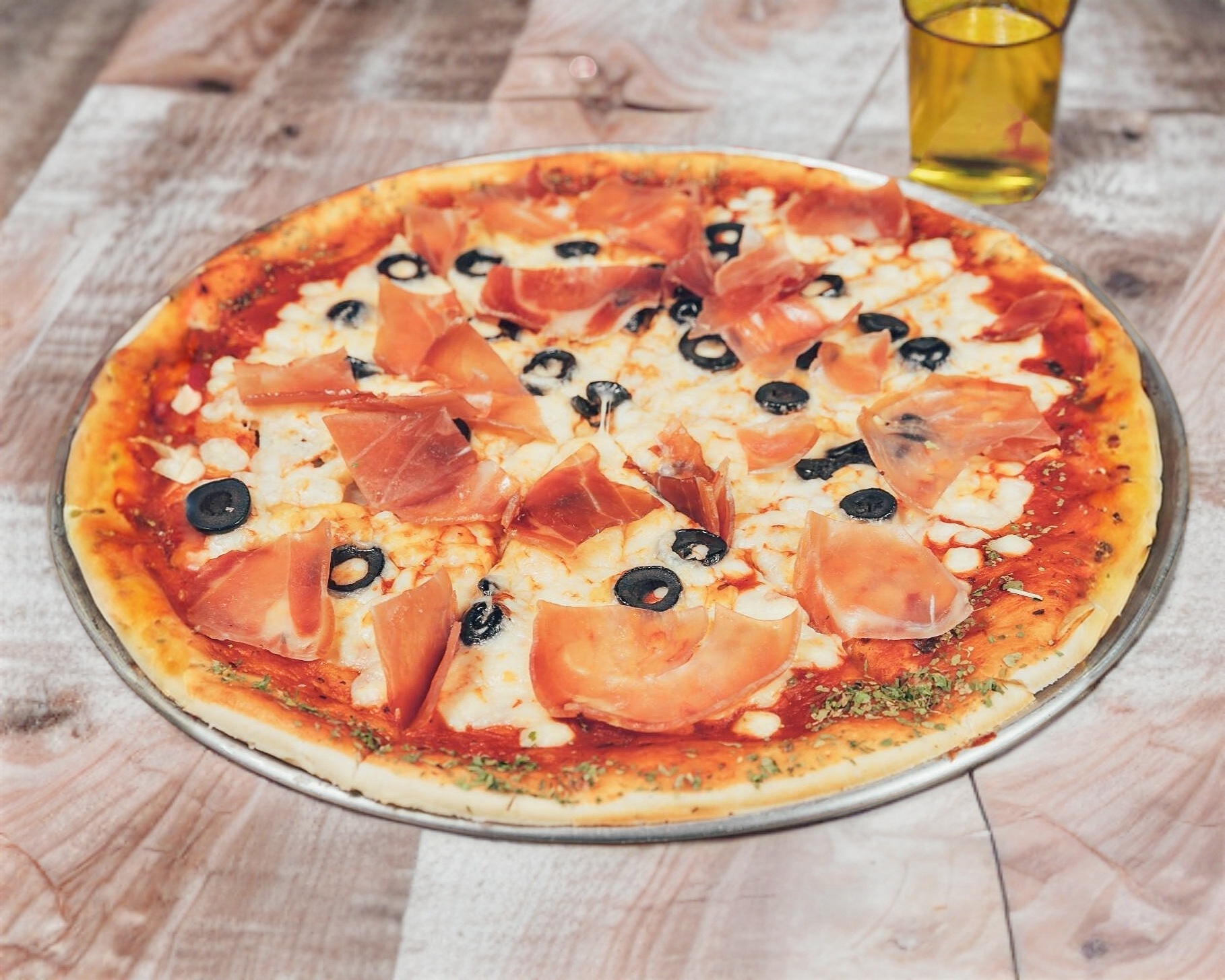 Preparada con láminas de jamón serrano, aceitunas negras, queso parmesano rallado, de tamaño mediano con base estilo napolitano, cubierta de salsa de jitomate y queso mozzarella.