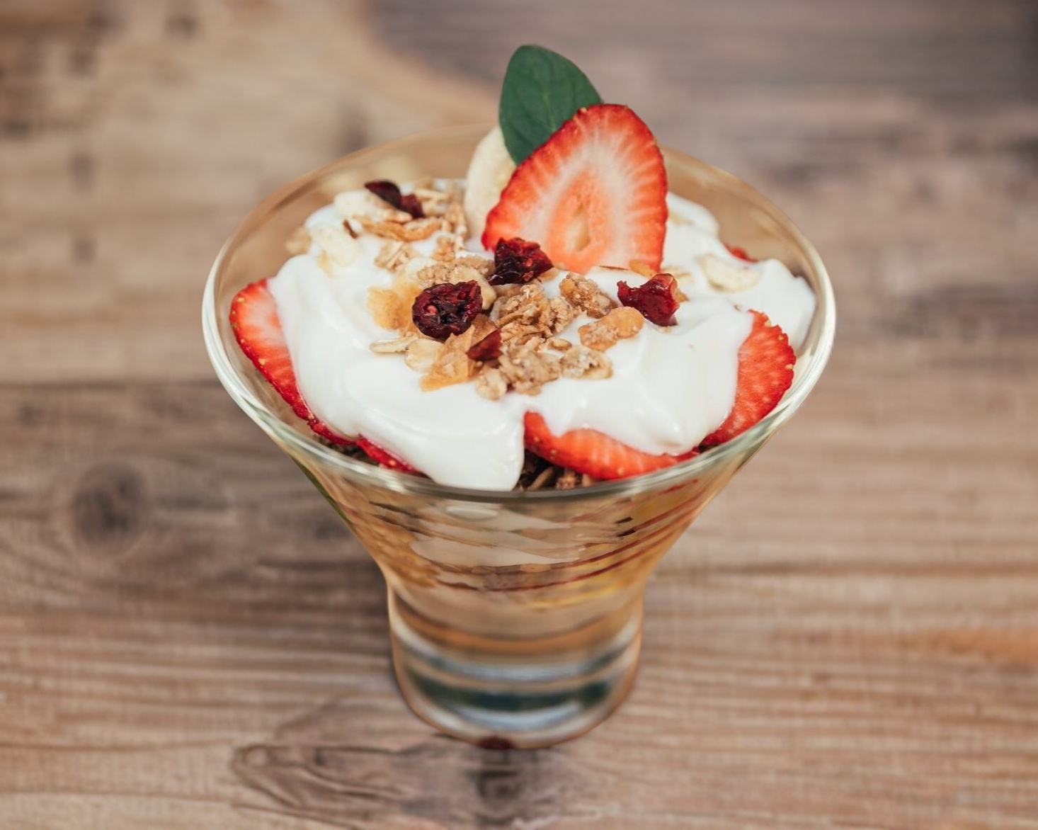 Vaso con yogurt griego, fresa natural, plátano, miel de abeja y granola.