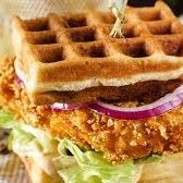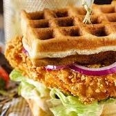 Waffles con palomitas de pollo, lechuga, jitomate, cebolla, bbq y papas
