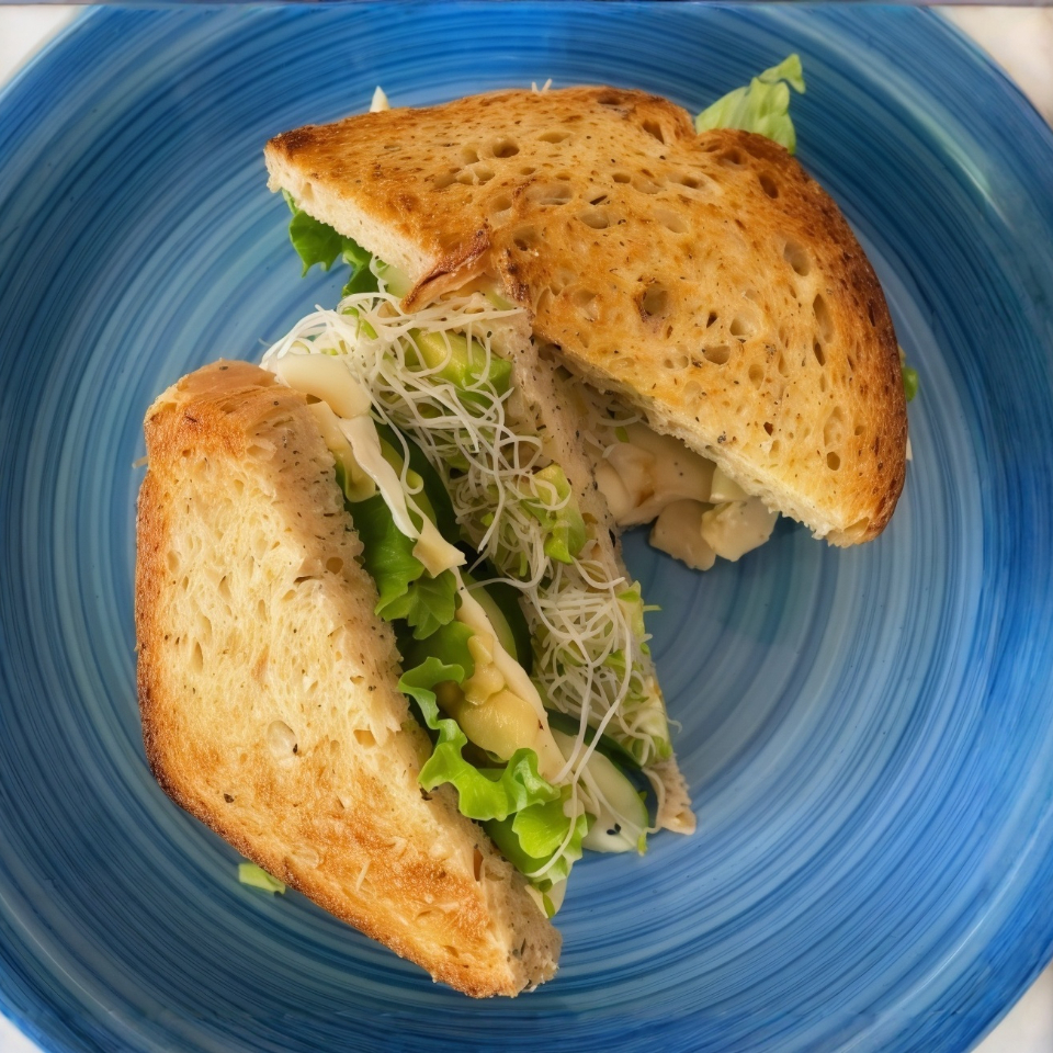 Pan de 12 granos, queso, lechuga, pepino, germen de alfalfa, aguacate, mayonesa y rajas o chipotle.