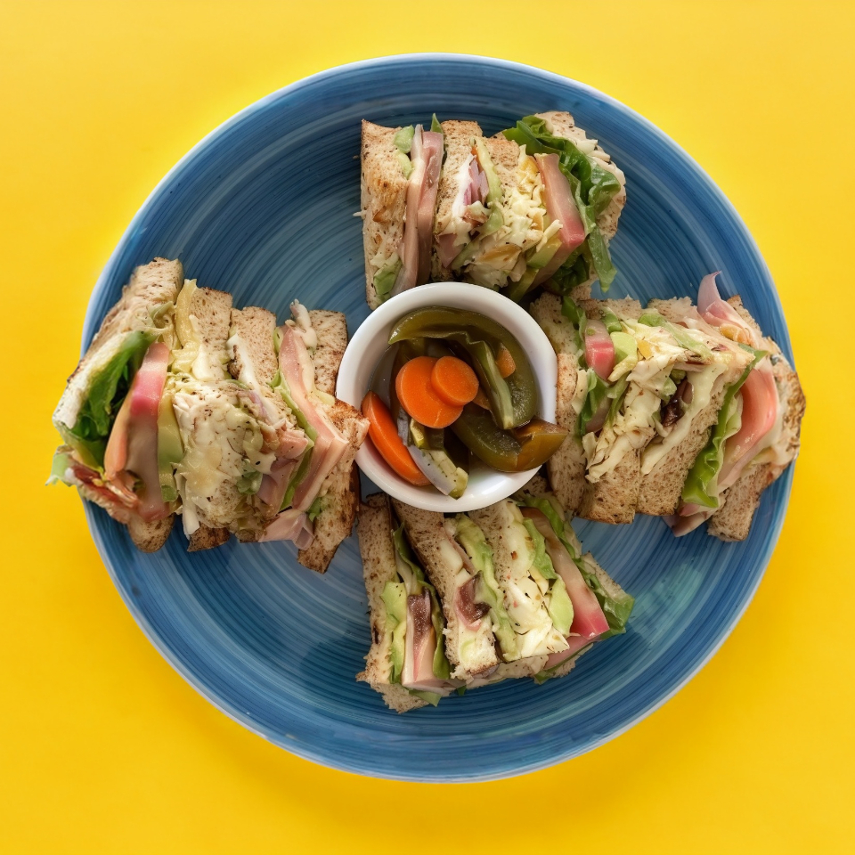 Sándwich de lechuga, jitomate, aguacate, tocino, queso manchego, pollo y jamón.