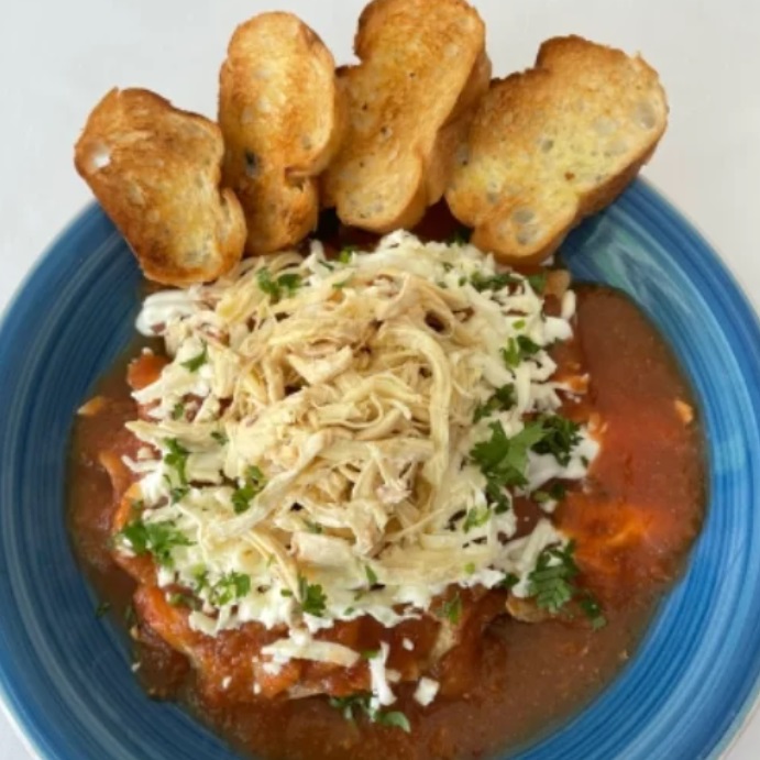 3 pz de tortilla de maíz bañadas en salsa roja rellenas de pollo bañadas con crema, queso y cebolla. Acompañadas de un bolillo.