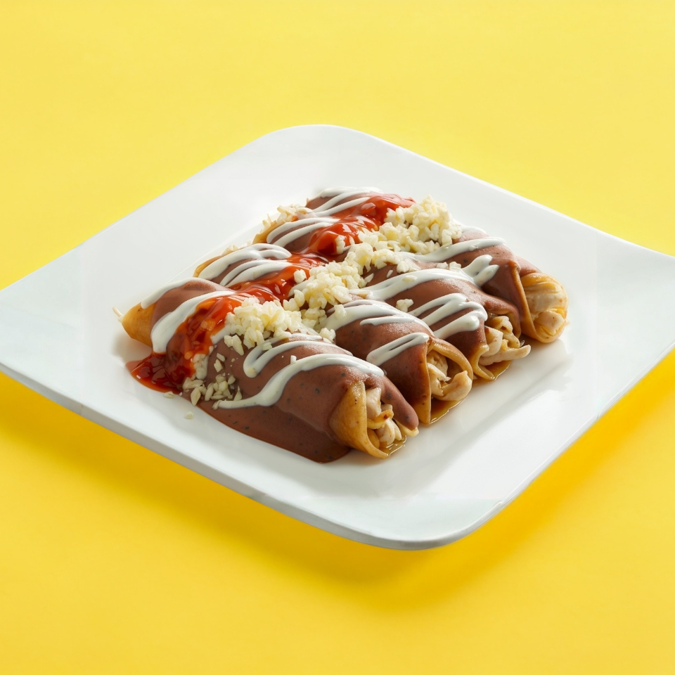 3pz de tortilla de maíz bañadas en mole poblano rellenas de pollo con queso, crema, cebolla y acompañadas de un bolillo.