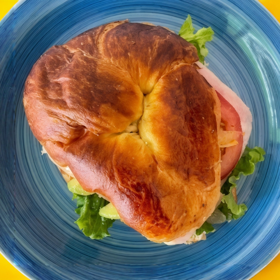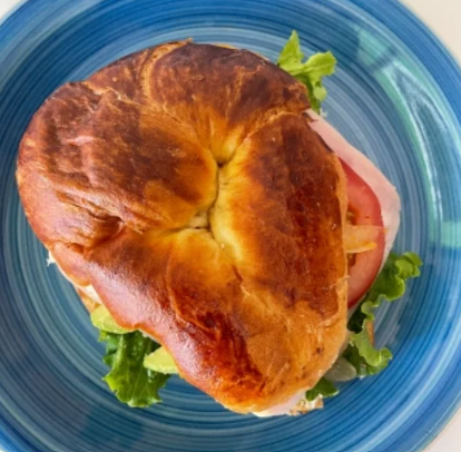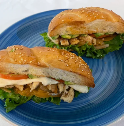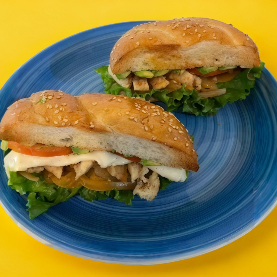Pan tipo croissant, lechuga, jitomate, aguacate, mayonesa, cebolla caramelizada y rajas o chipotle.