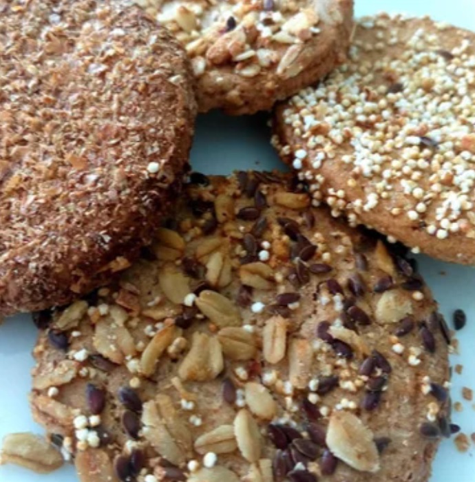Galleta integral con granos: amaranto, semillas de girasol, avena, linaza.