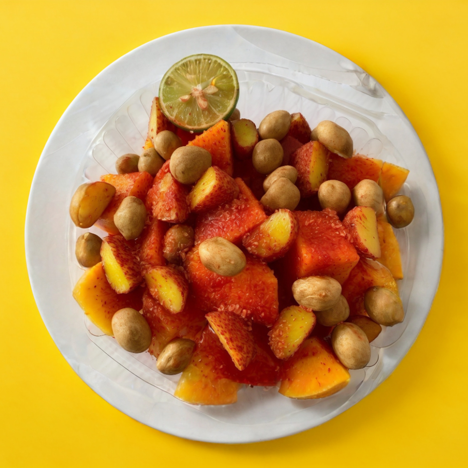 Naranja, mango o sandía (depende la temporada) con chamoy, miguelito, cacahuate y gomitas de manguitos enchilados.