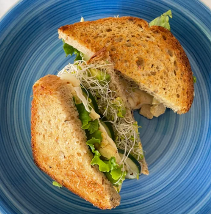 pan de 12 granos, queso, lechuga, pepino, germen de trigo, aguacate, mayonesa, cebolla caramelizada y picante.