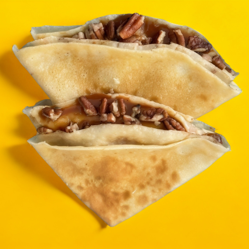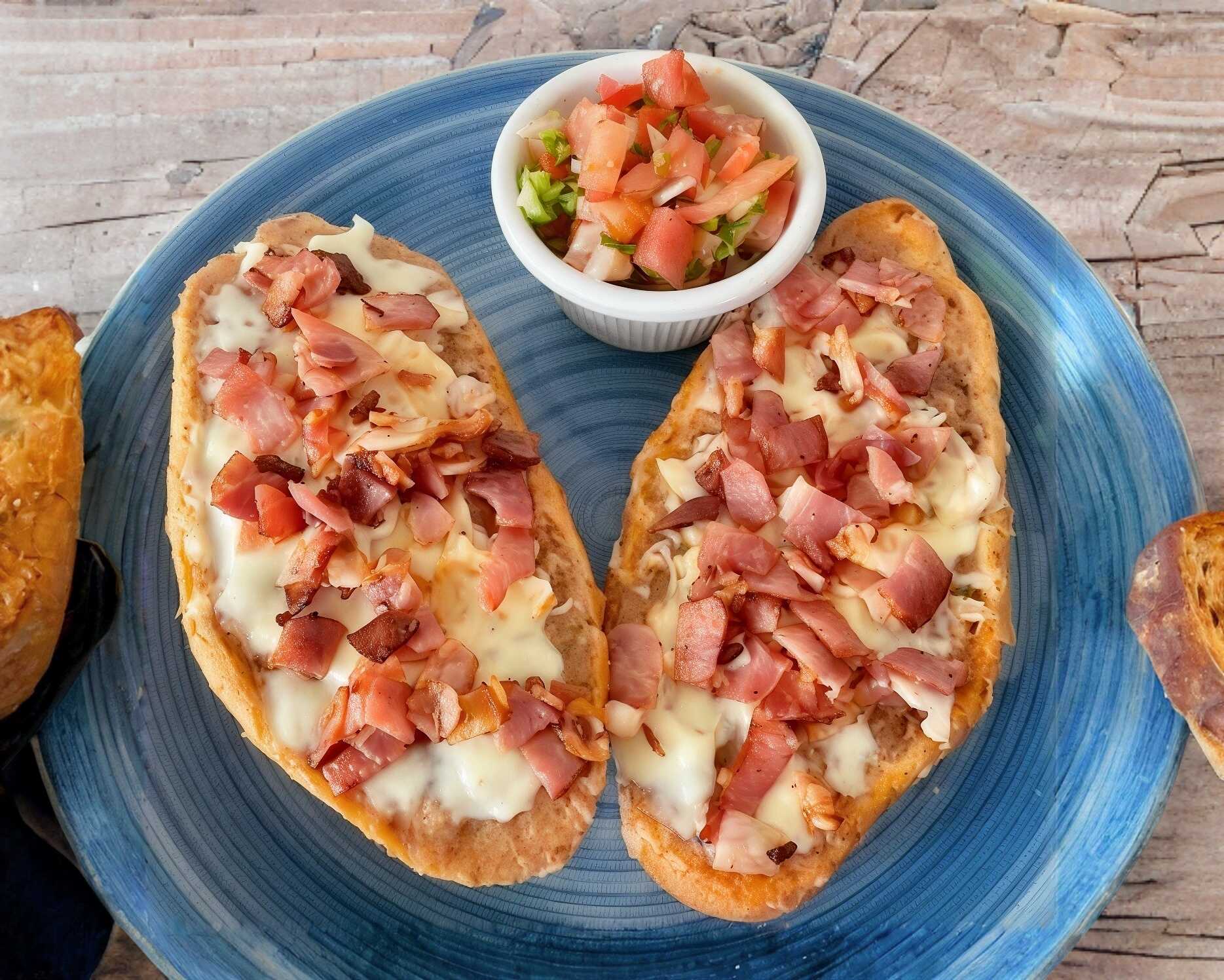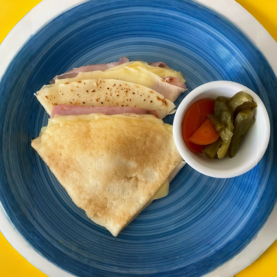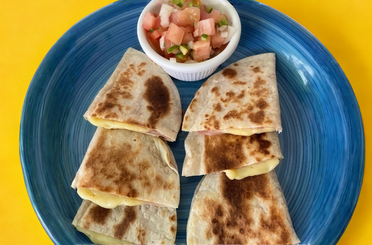 Tortilla de harina, jamón de pavo, queso, acompañadas de pico de gallo. El queso es de manchego.