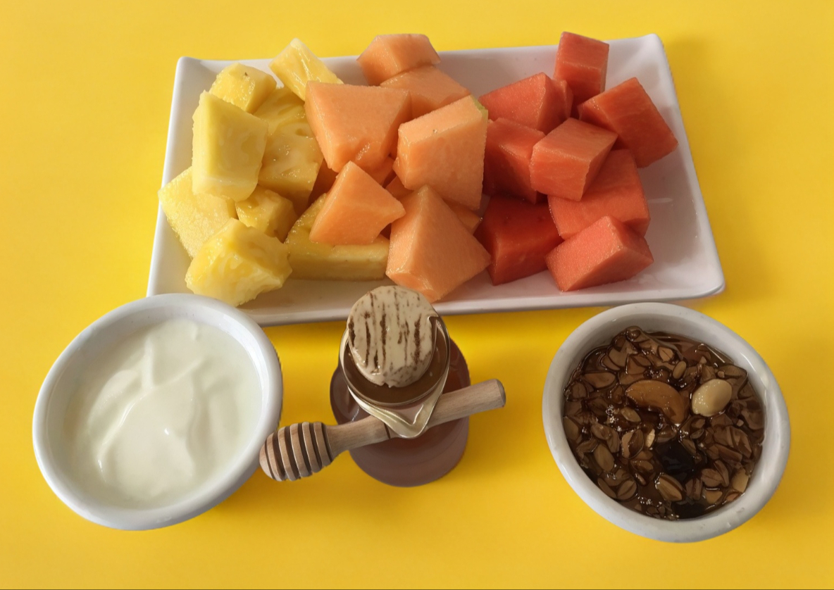 Papaya, melón, piña, plátano, manana, sandía, guayaba, yogurt, miel y granola.