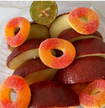 Manzana cubierta de chamoy, sobre una cama de zanahoria y jícama rayada con gomitas de aritos de durazno.