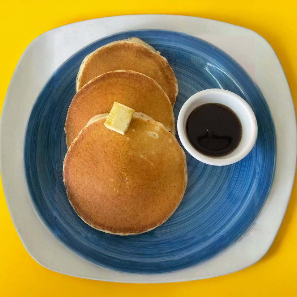 Receta tradicional de hotcakes, acompañados de miel maple y mantequilla.