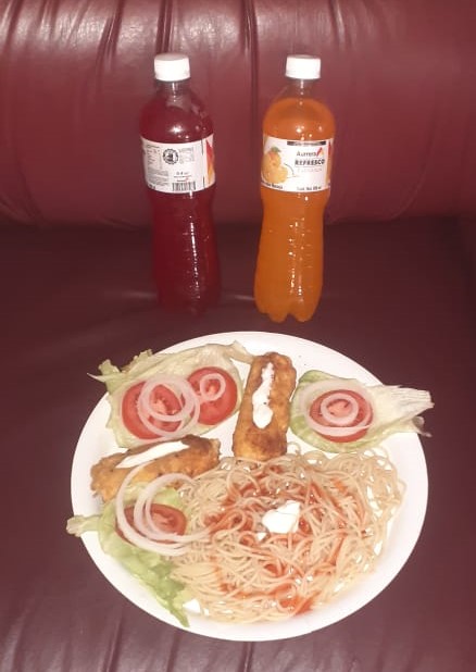 Pizza familiar, 3 refrescos y 3 espaguetis.