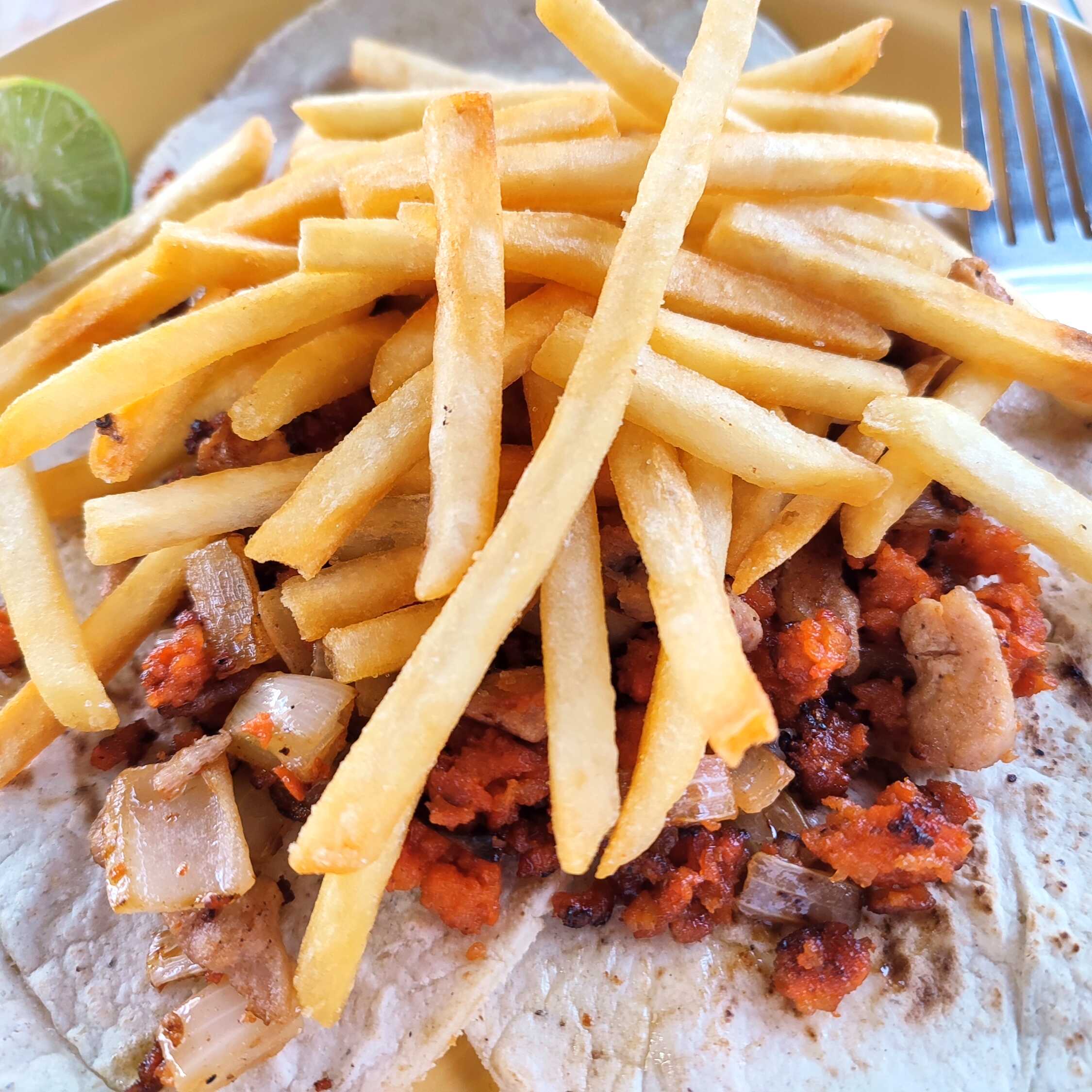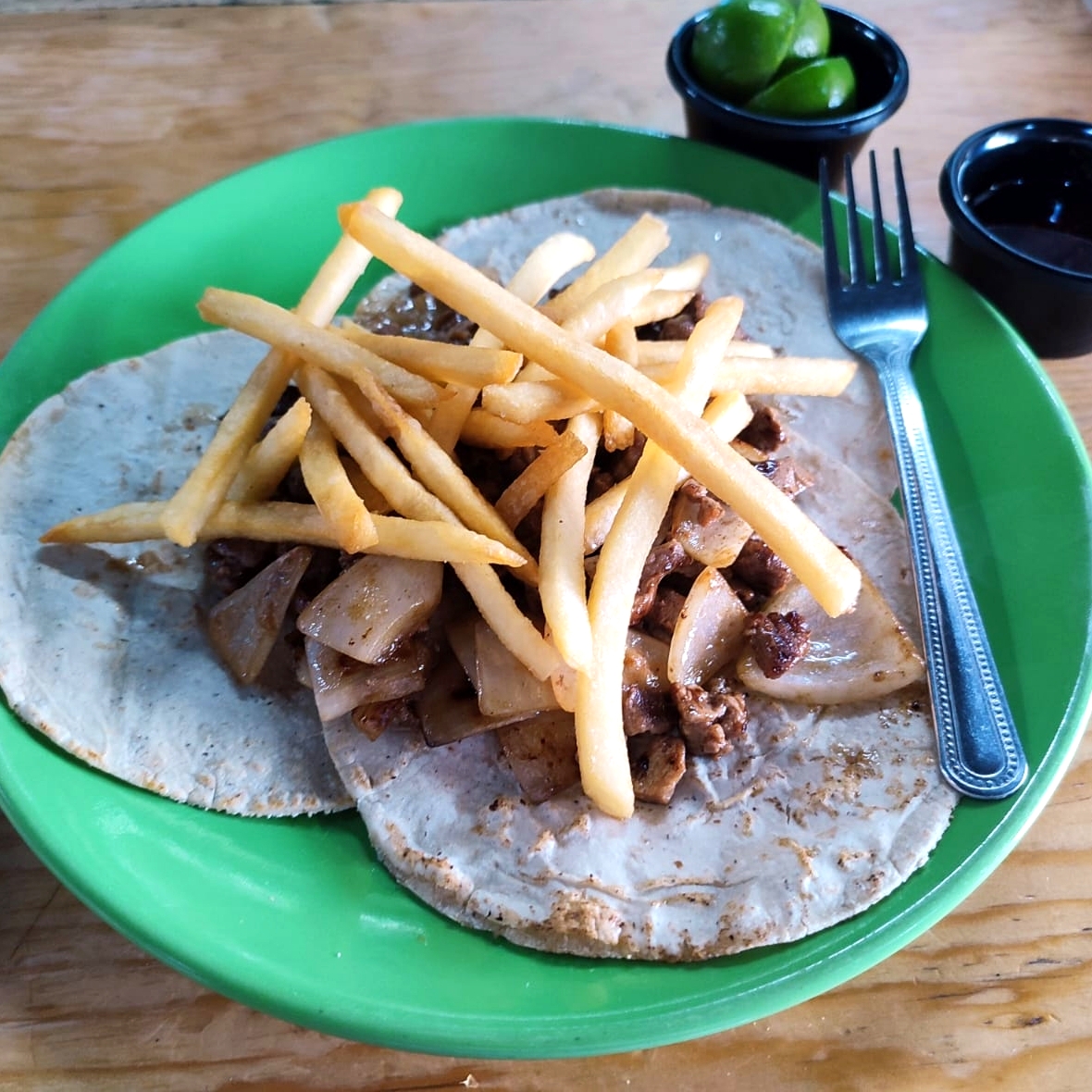 Orden de 3 Tacos de Bistec de cerdo con Chorizo, acompañado de Papas a la Francesa (Limón y Salsa Macha aparte).