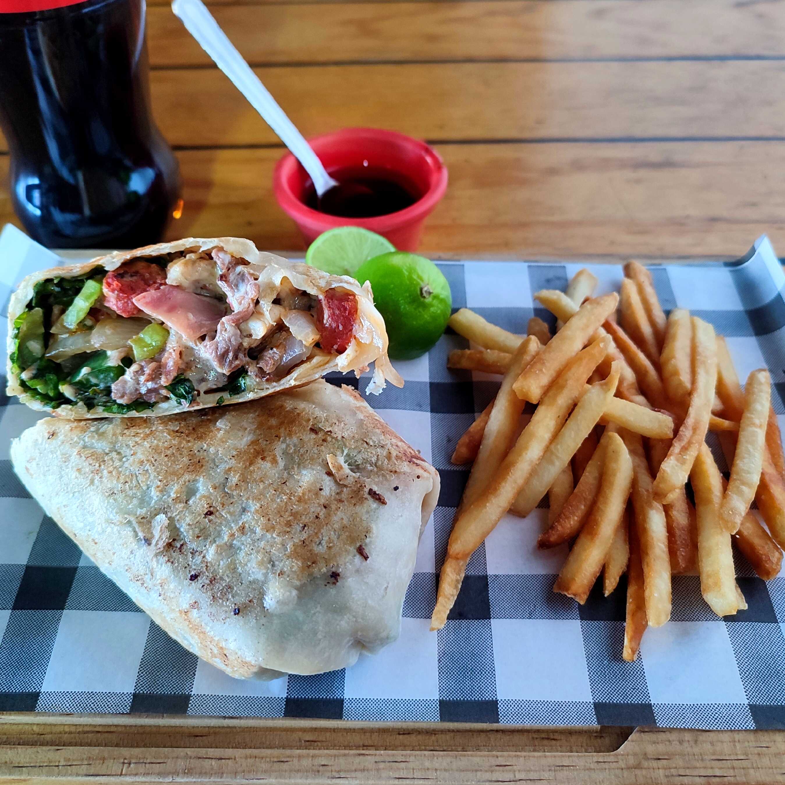 Burrito de Bistec y Longaniza con Frijoles, Lechuga, Queso Mozarella y Cebolla. Acompañado de Papas a la Francesa (Limón y Salsa Macha aparte).