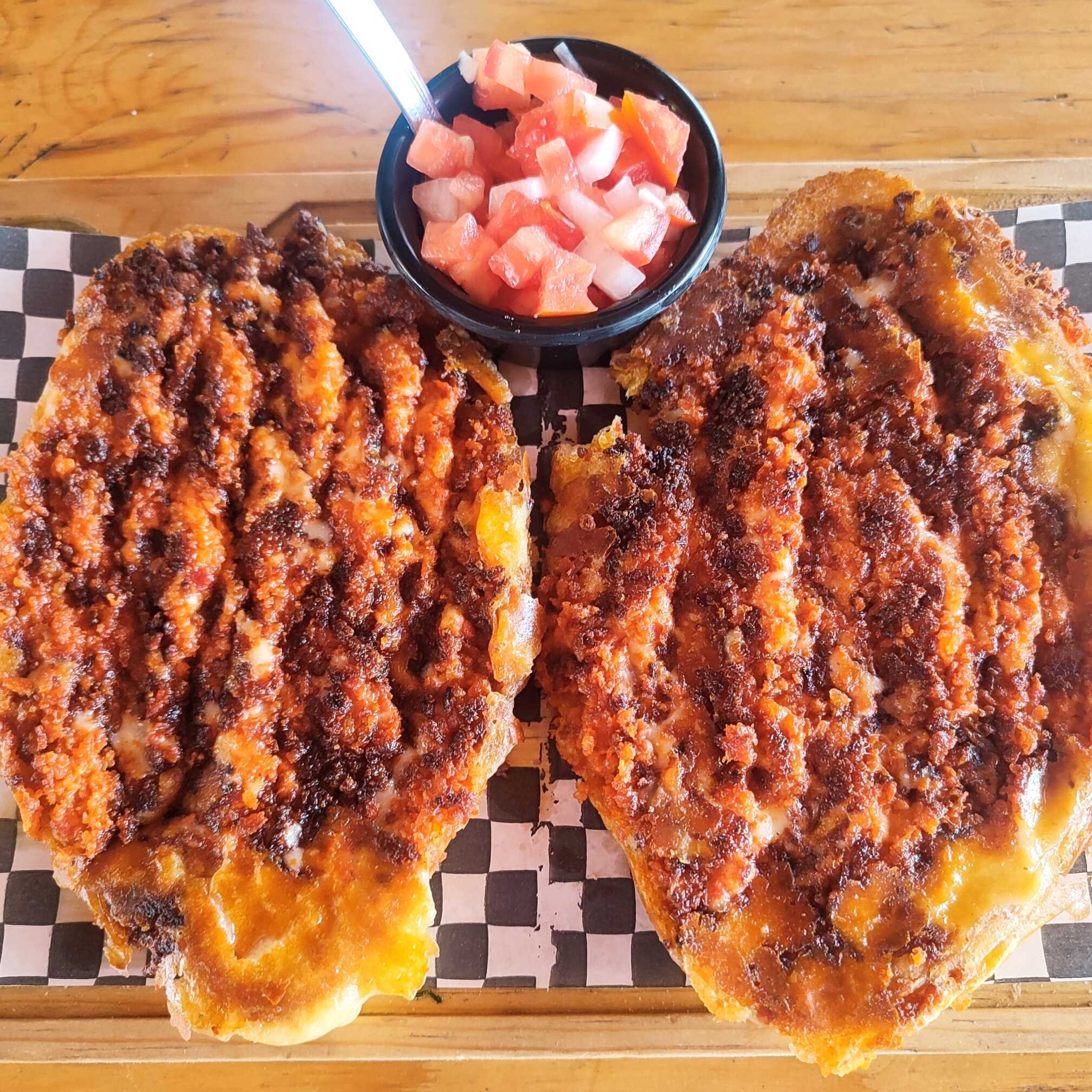 Bolillo con frijoles, queso mozarella y chorizo. (Pico de gallo y jalapeños o chipotle aparte).