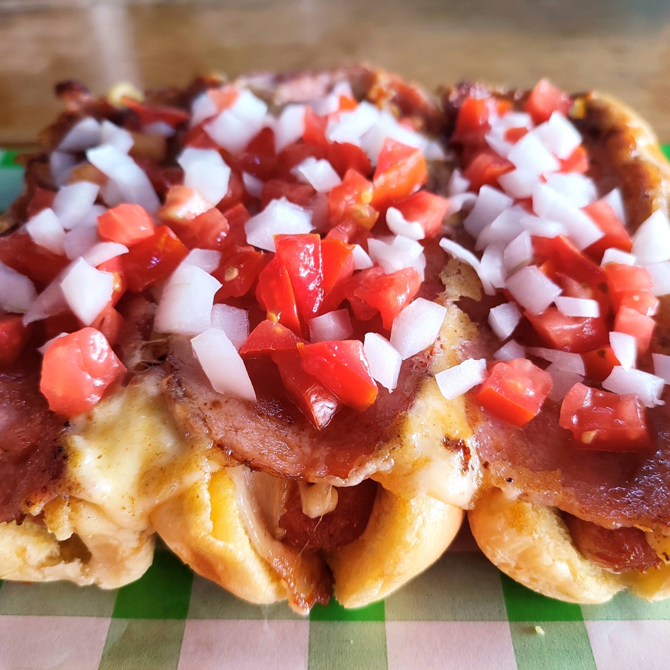 Orden de 3 Hotdogs con Tocino, Queso Mozarella, Jitomate, Cebolla y Catsup. (Mostaza y Jalapeños aparte.)