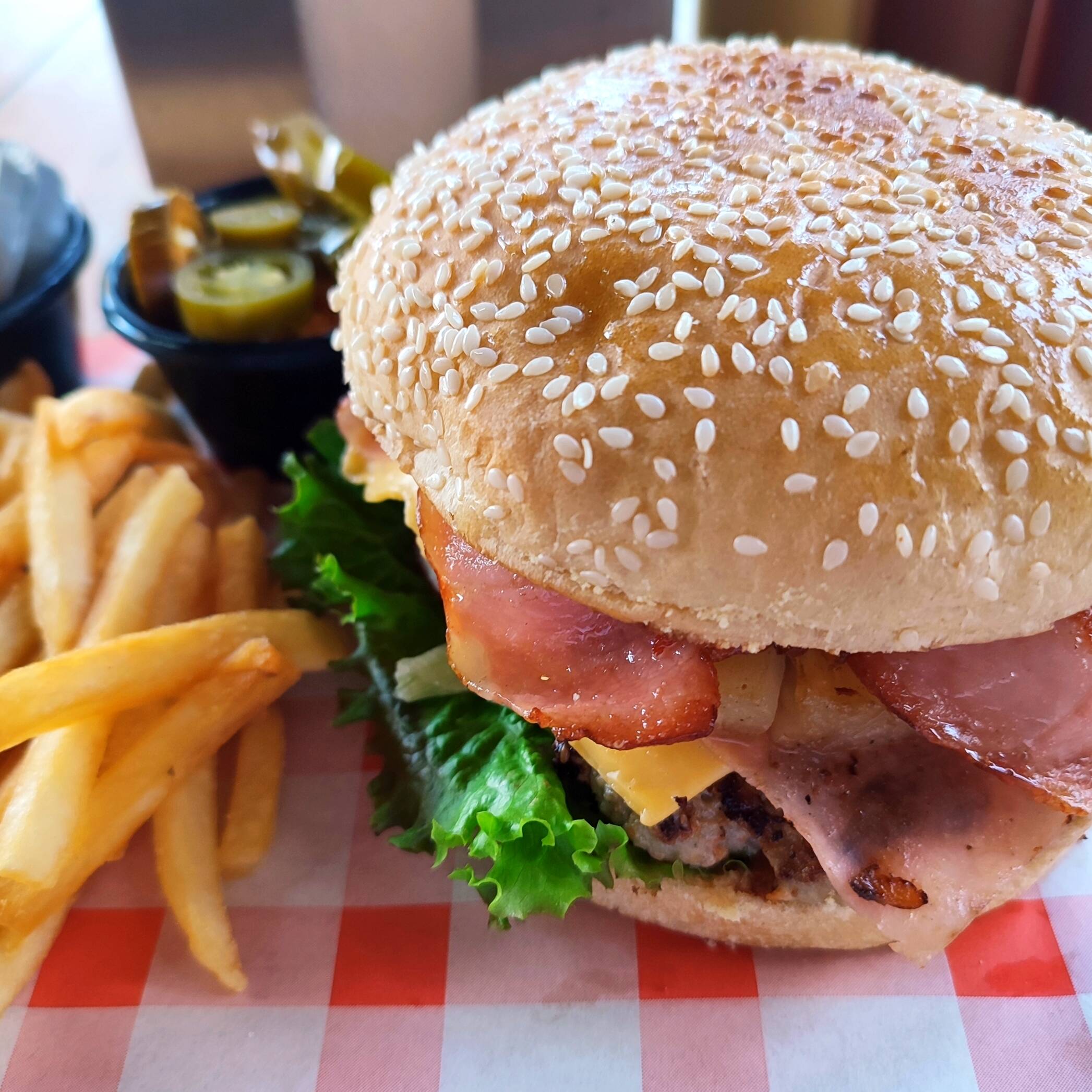 Hamburguesa de Boneless, Queso Mozarella, Tocino y BBQ con Jitomate, Cebolla, Lechuga. (Jalapeños y Pepinillos aparte).