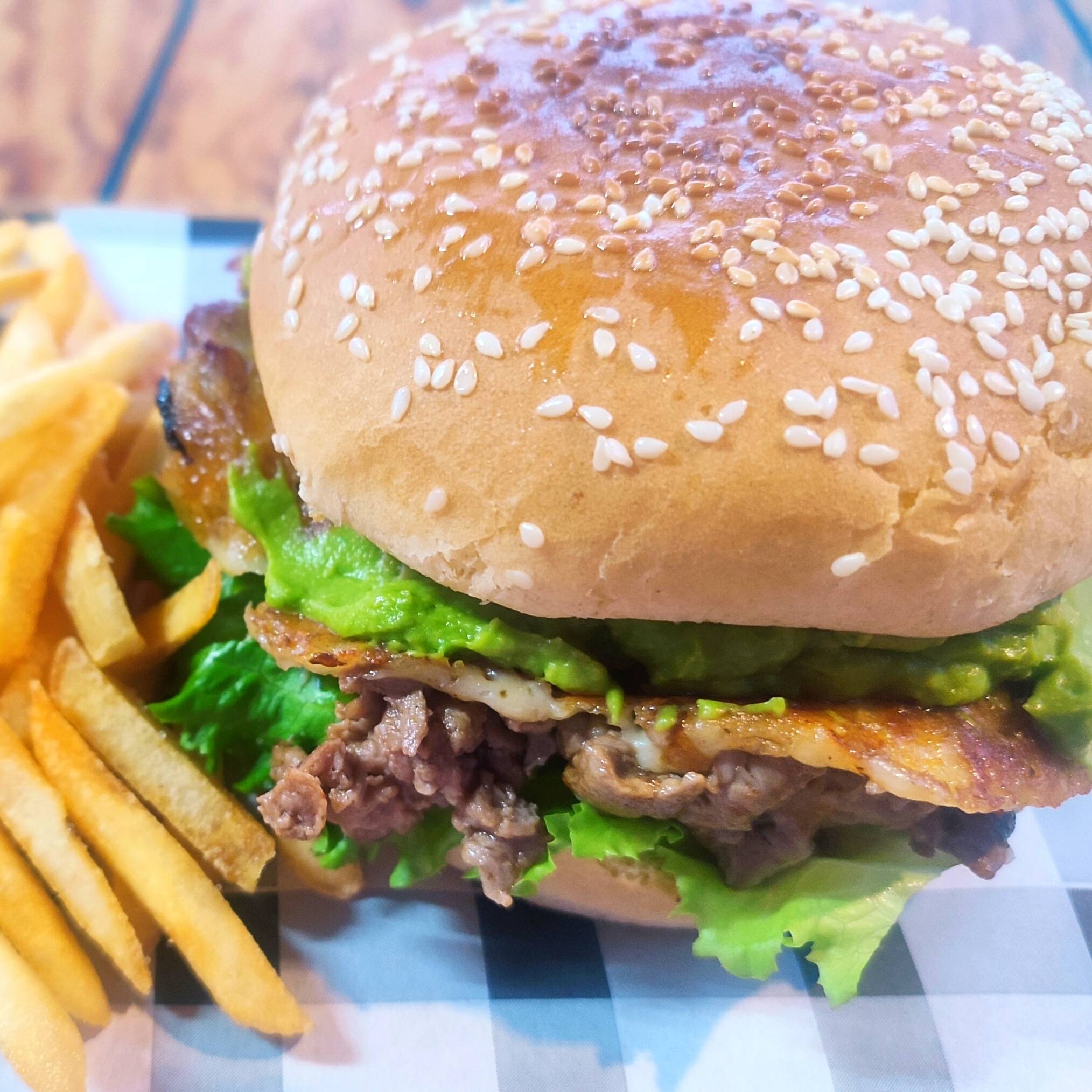 Hamburguesa de Arrachera, Queso Mozarella y Guacamole con Lechuga, Jitomate, Cebolla (Jalapeños y Pepinillos aparte).