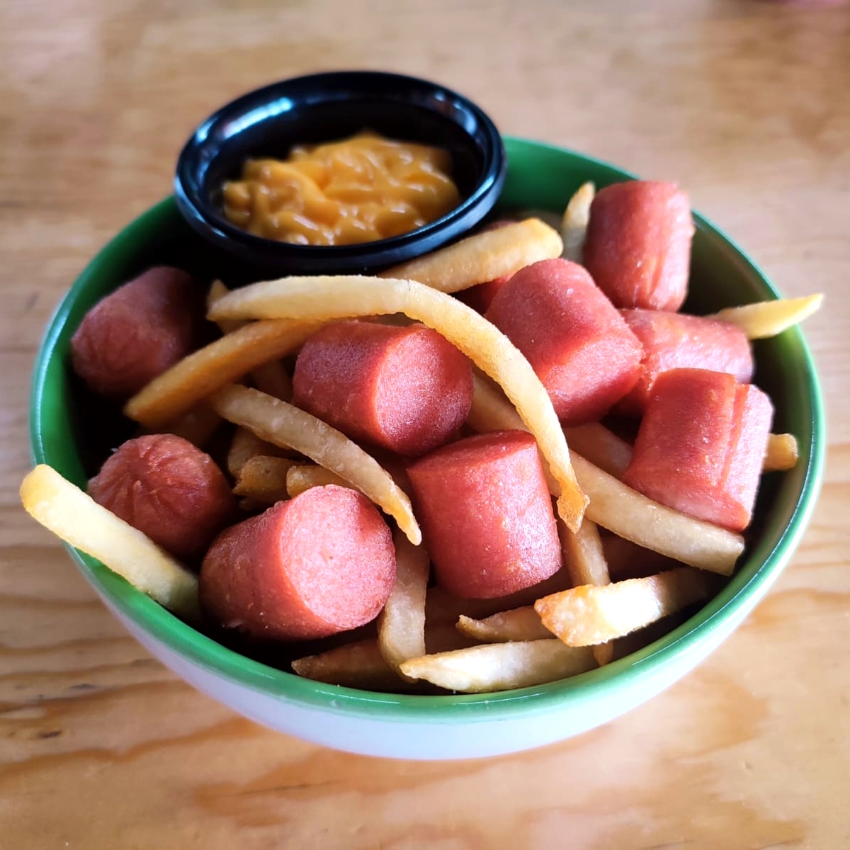 220g de Papas a la Francesa con trocitos de Salchicha Frita (Catsup, Queso Amarillo y Salsa Valentina aparte)