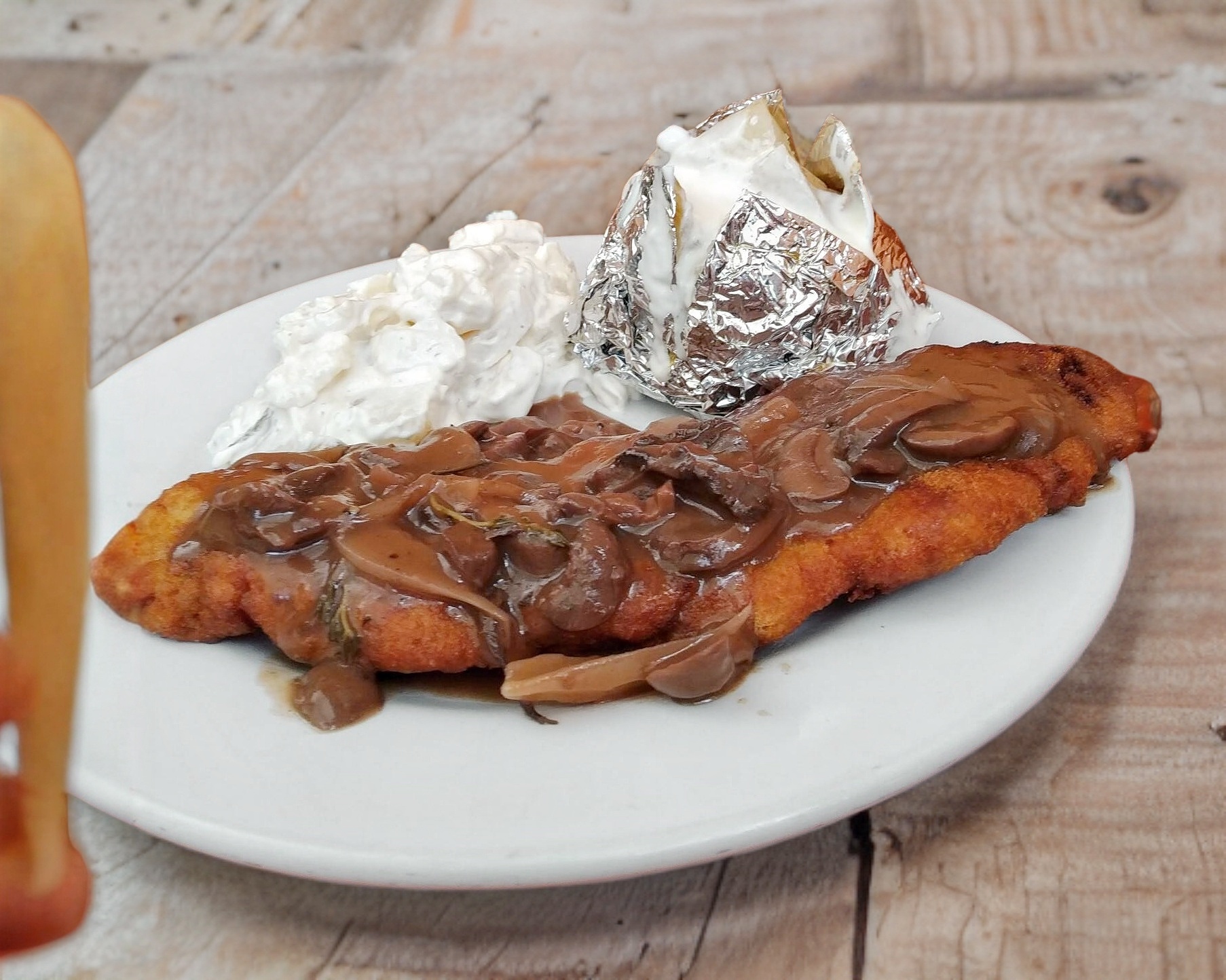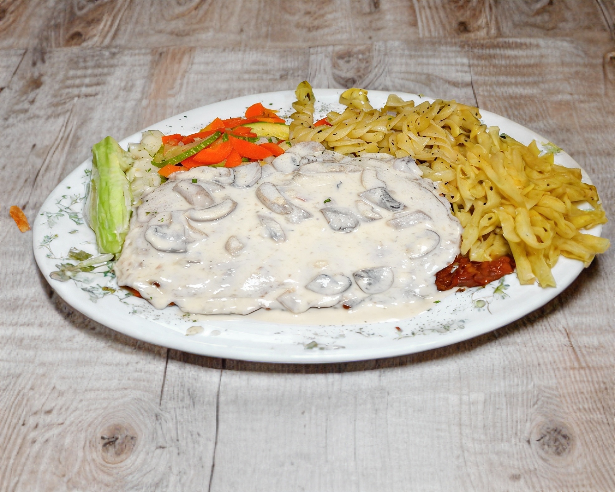 200 Grs. carne de cerdo empanizada bañada en salsa de champiñones, acompañada de dos guarniciones a elegir; papas hervidas, papas fritas, arroz, pasta, semmel knödel, col agria, puré de papa, verduras al vapor, ensalada de papa, papa alemana, verduras a la mantequilla, papa al horno.