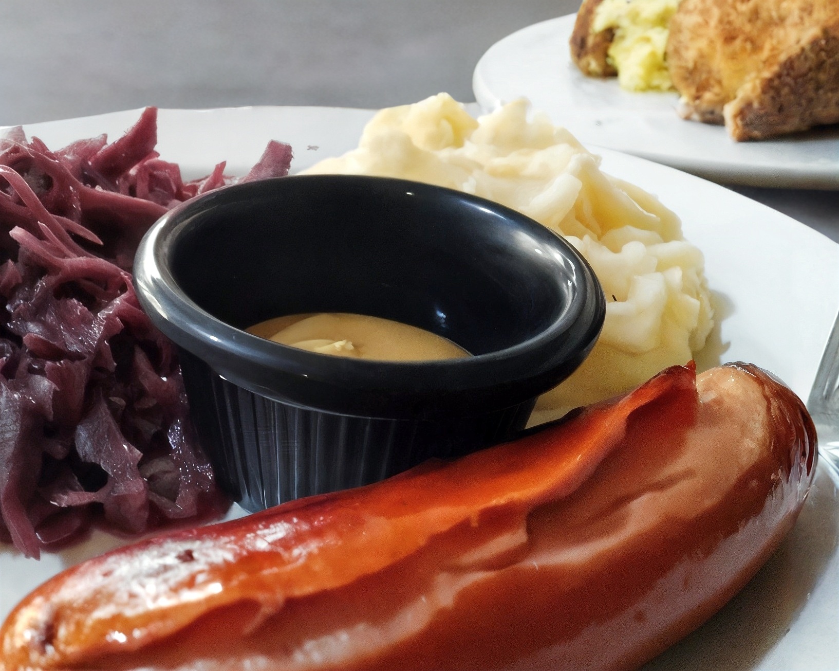 180 Grs. Deliciosa salchicha de consistencia blanda y sutil sabor a especias, acompañada de dos guarniciones a elegir: papas hervidas, papas fritas, arroz, pasta, semmel knödel, col agria, puré de papa, verduras al vapor, ensalada de papa, papa alemana, verduras a la mantequilla, papa al horno.