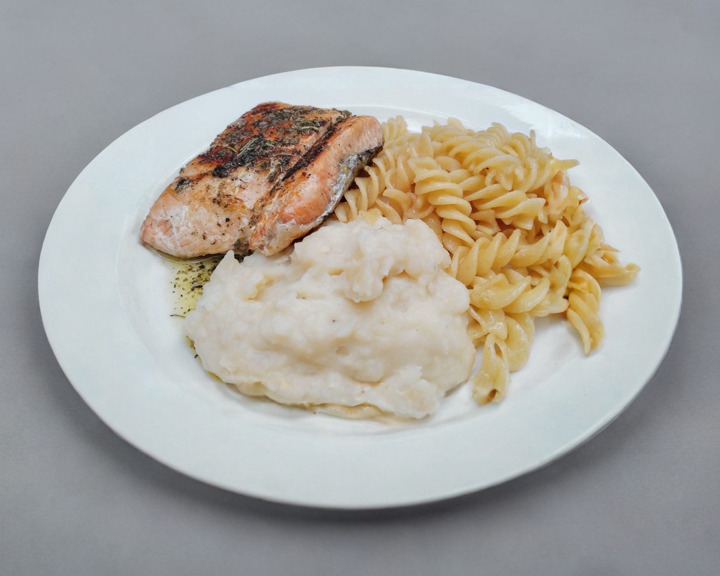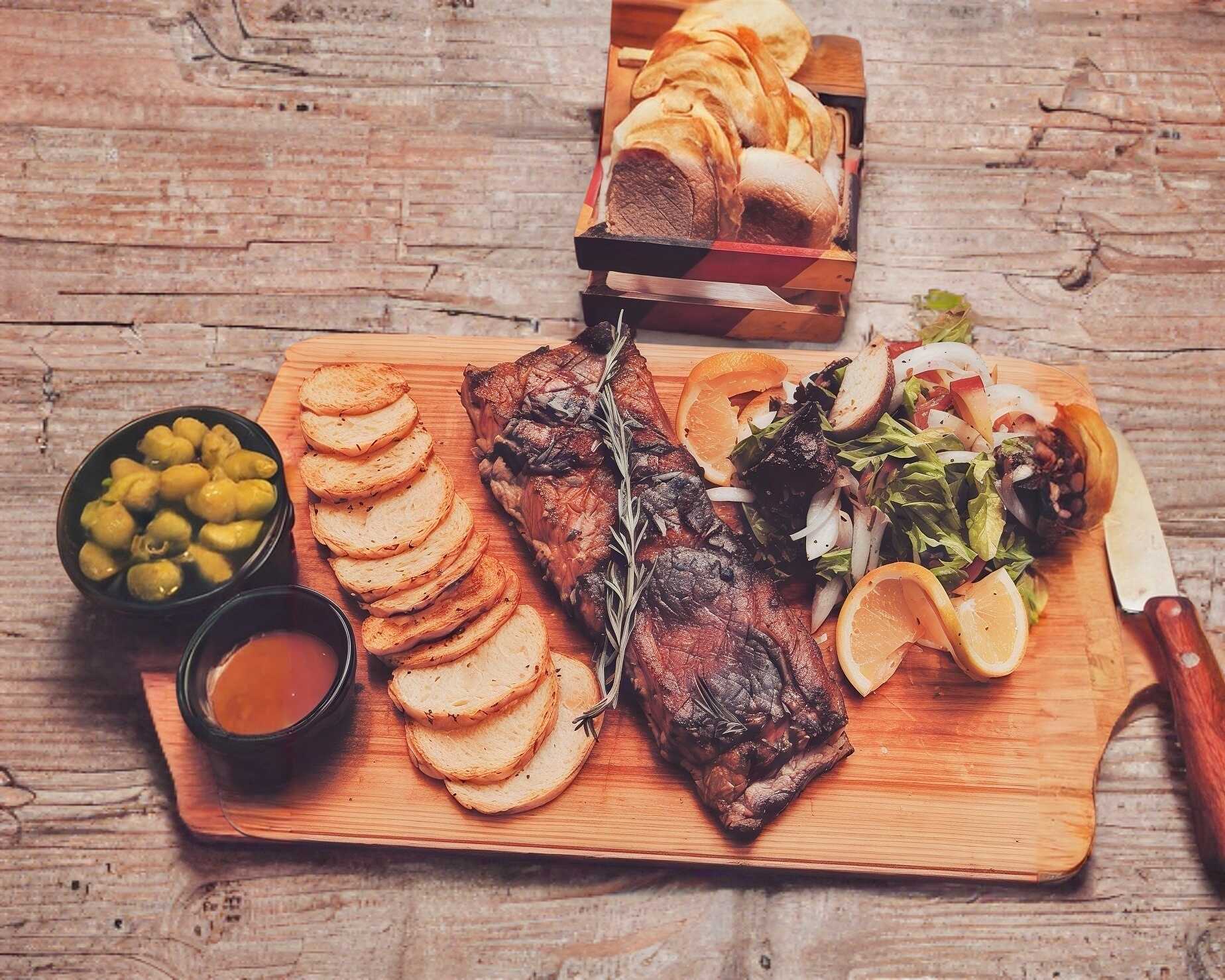 650 Grs. plato con 6 carnes asadas; pollo, chuleta, arrachera, salmón, salchicha bratwurst y thuringer, acompañado de dos guarniciones a elegir: papas hervidas, papas fritas, arroz, pasta, semmel knödel, col agria, puré de papa, verduras al vapor, ensalada de papa, papa alemana, etc.