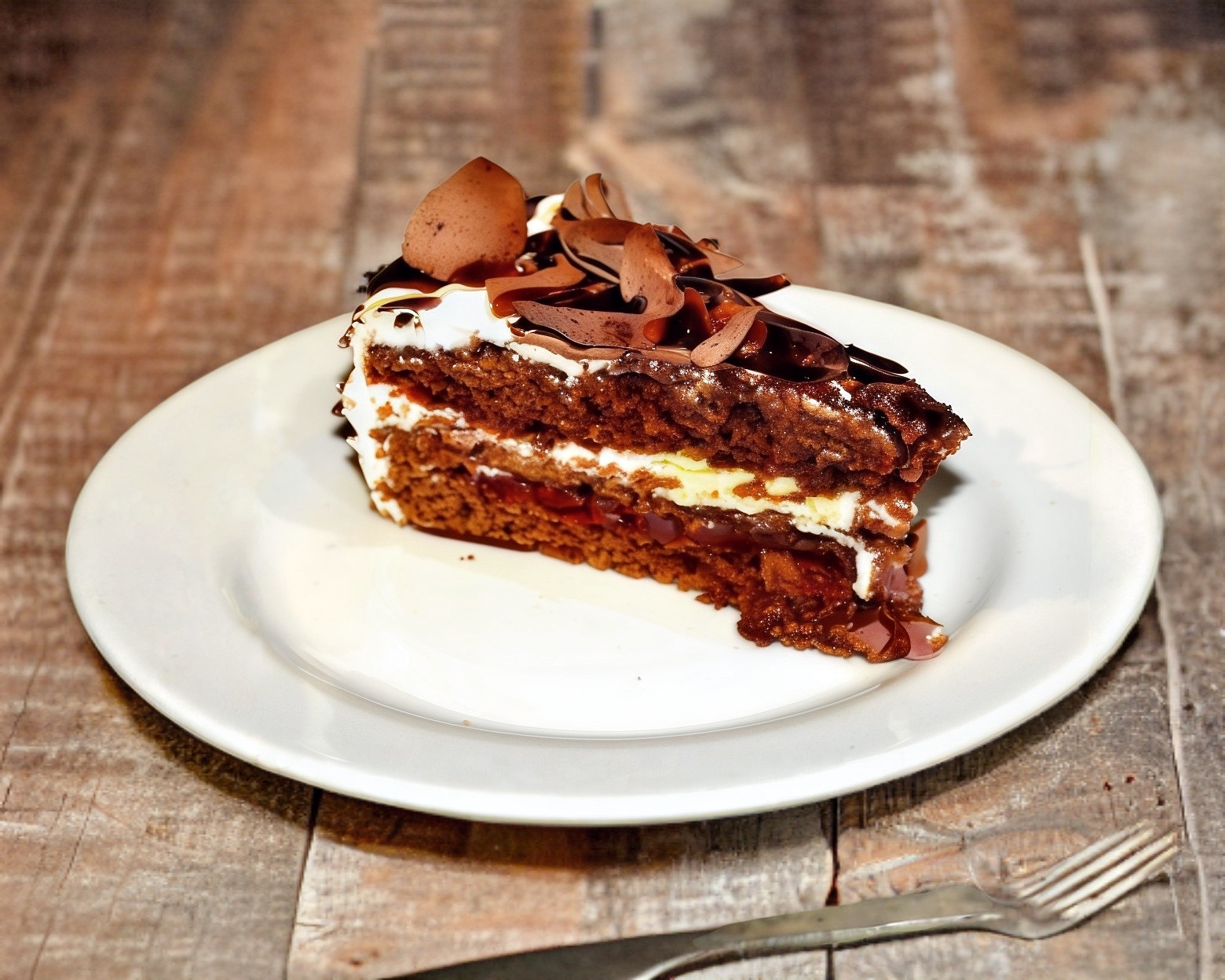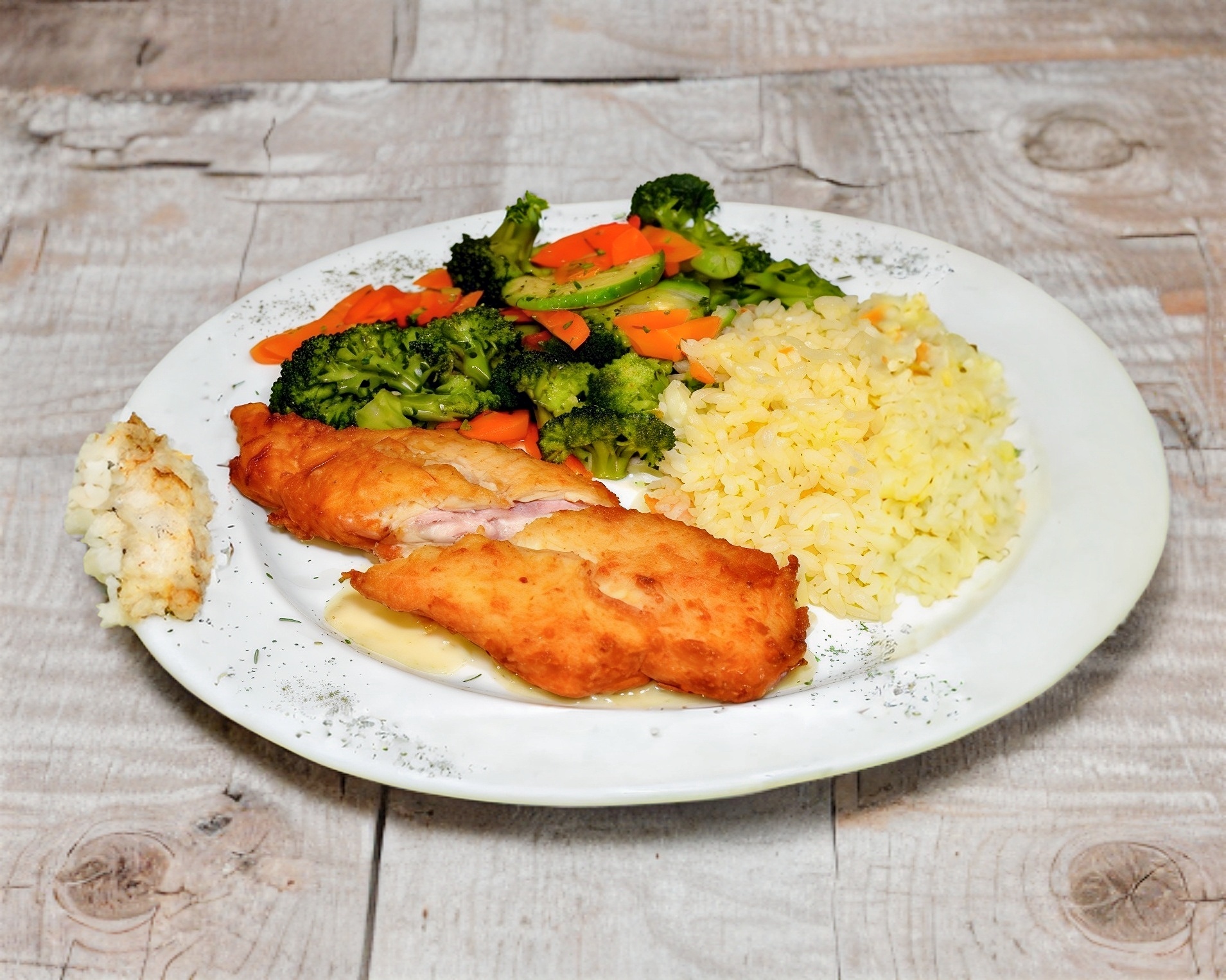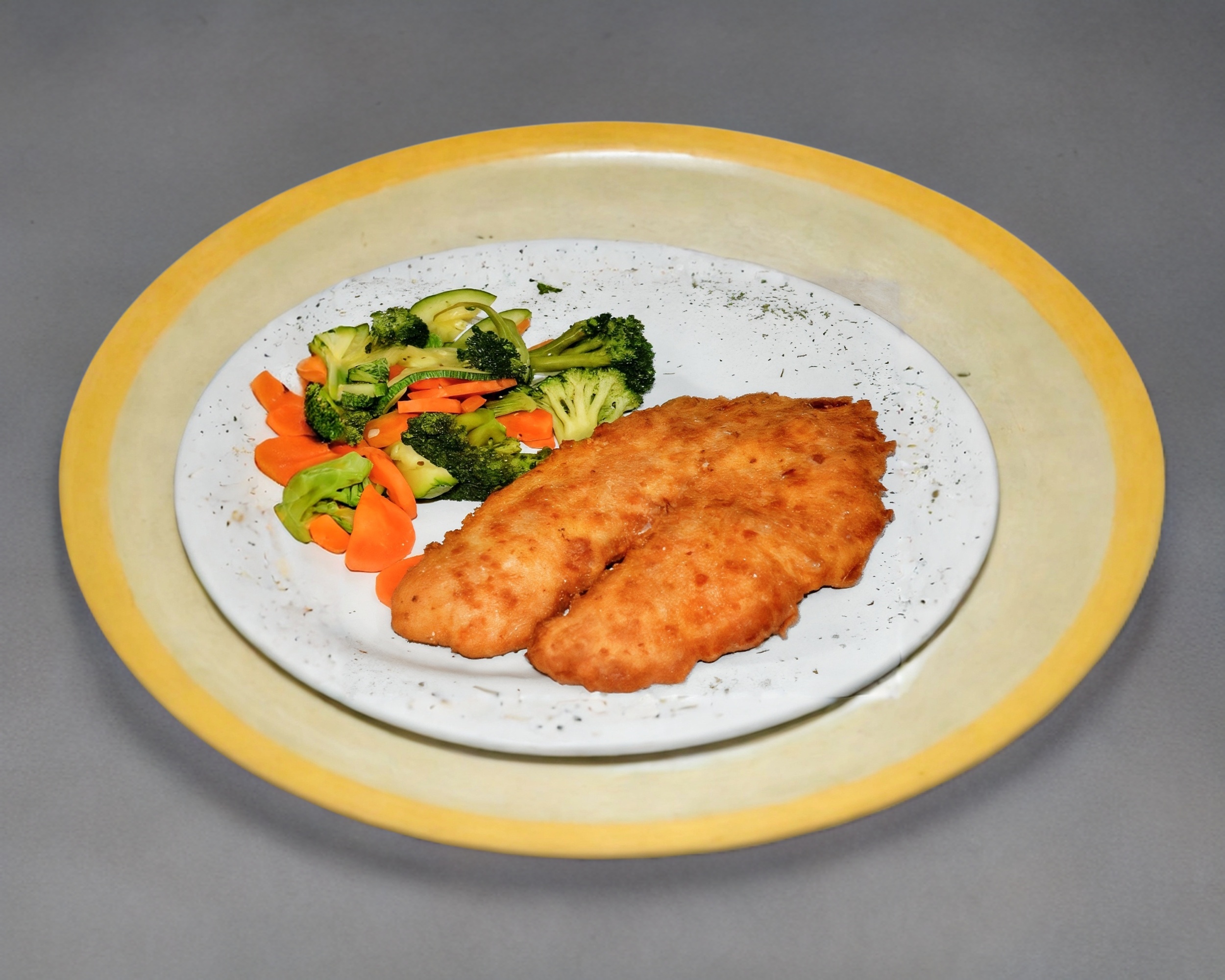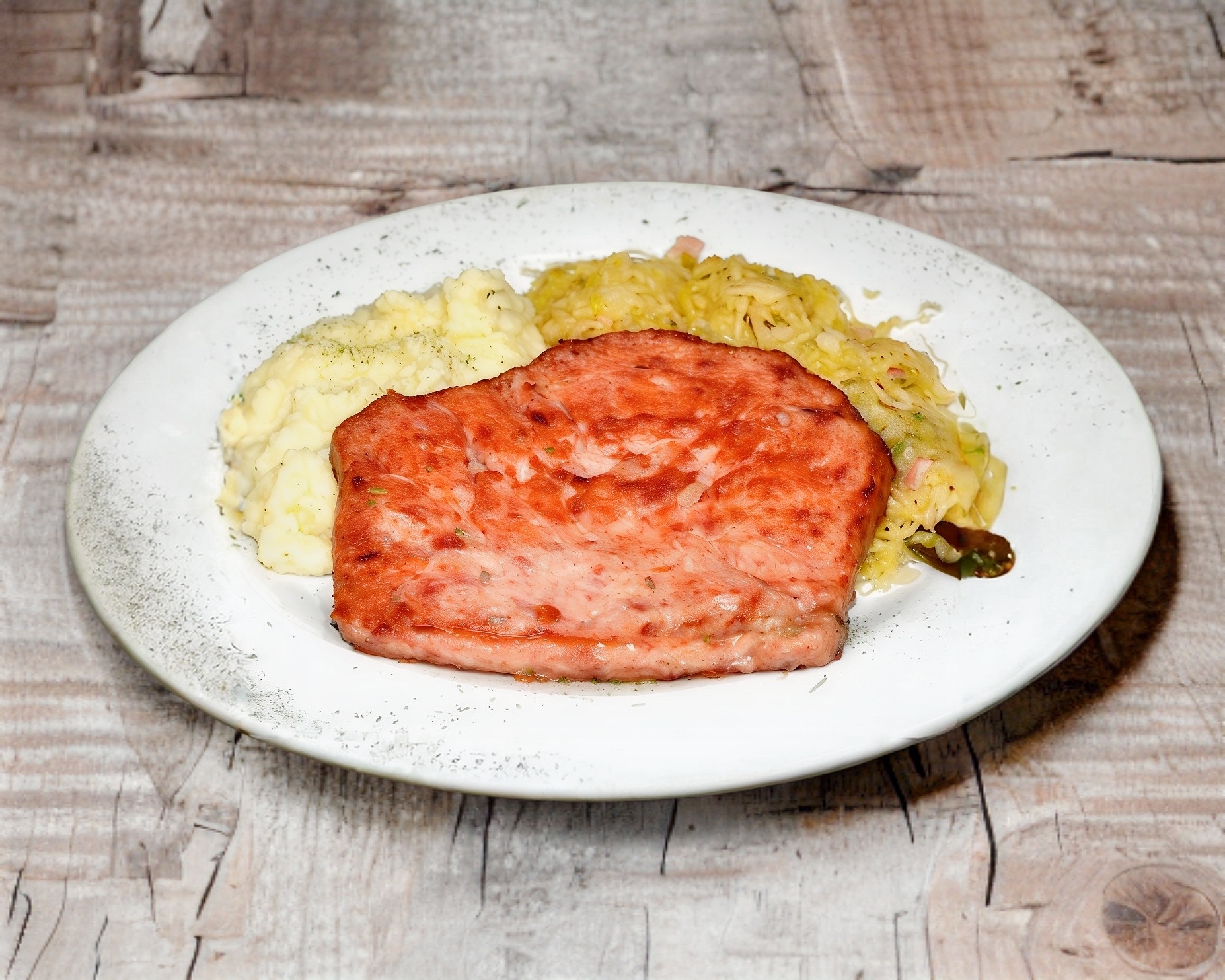 200 Grs. de rebanada de pastel sellada a la plancha con dos guarniciones a elegir elegir: papas hervidas, papas fritas, arroz, pasta, semmel knödel, col agria, puré de papa, verduras al vapor, ensalada de papa, papa alemana, verduras a la mantequilla, papa al horno.