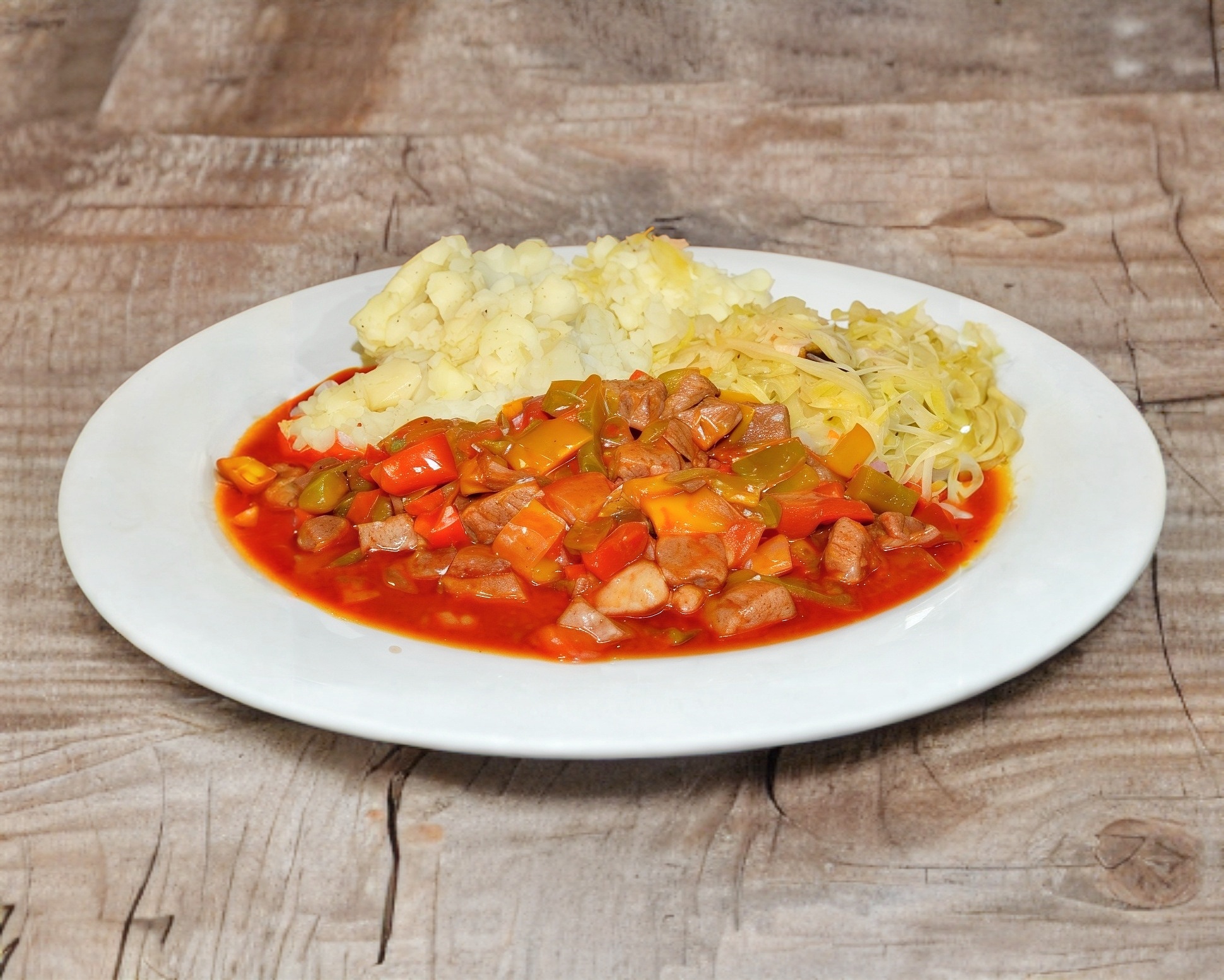 Acompañado de dos guarniciones a elegir: papas hervidas, papas fritas, arroz, pasta, semmel knödel, col agria, puré de papa, verduras al vapor, ensalada de papa, papa alemana, verduras a la mantequilla, papa al horno.