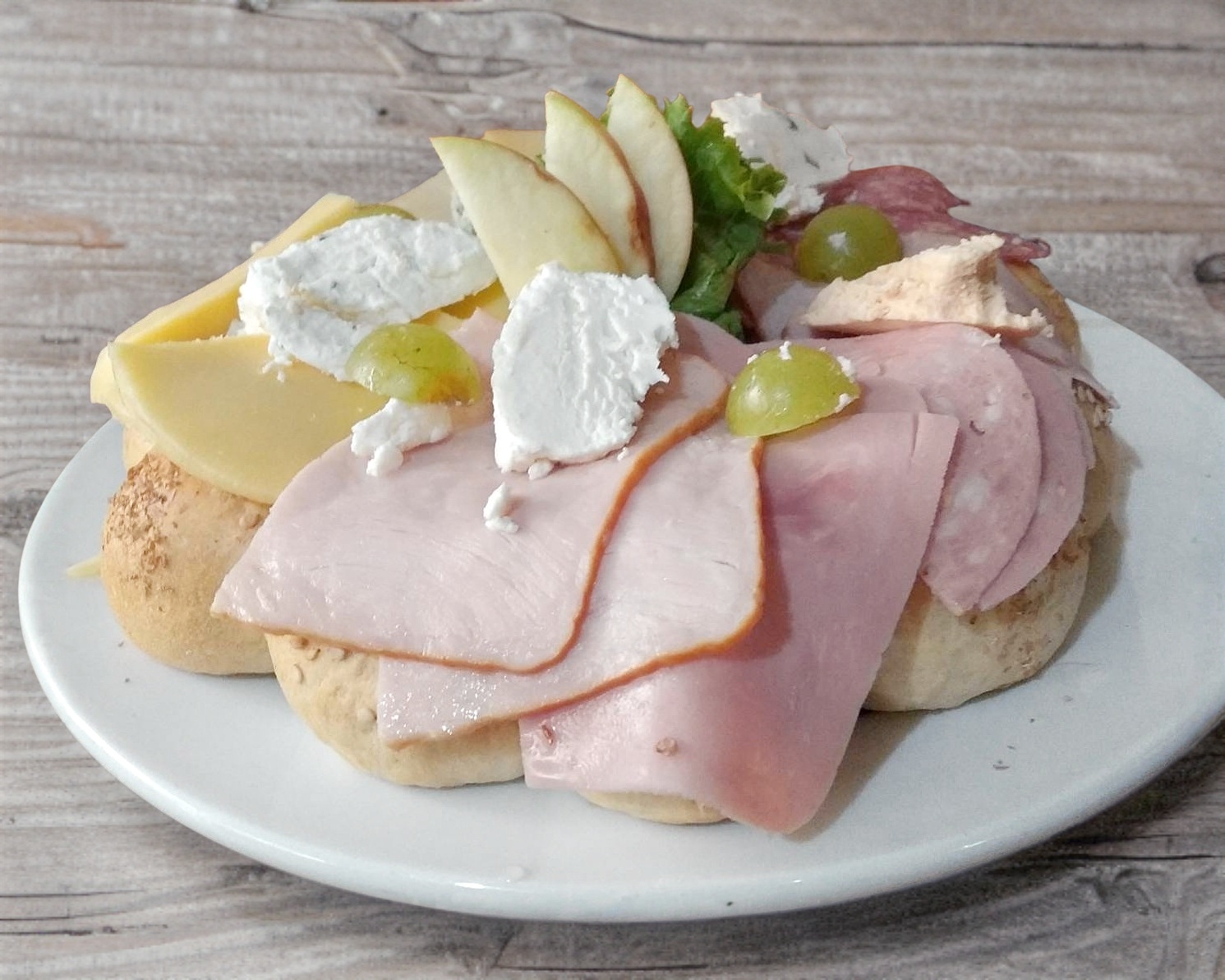 170 Gr. mix de quesos europeos acompañados de una rueda de pan con semillas.