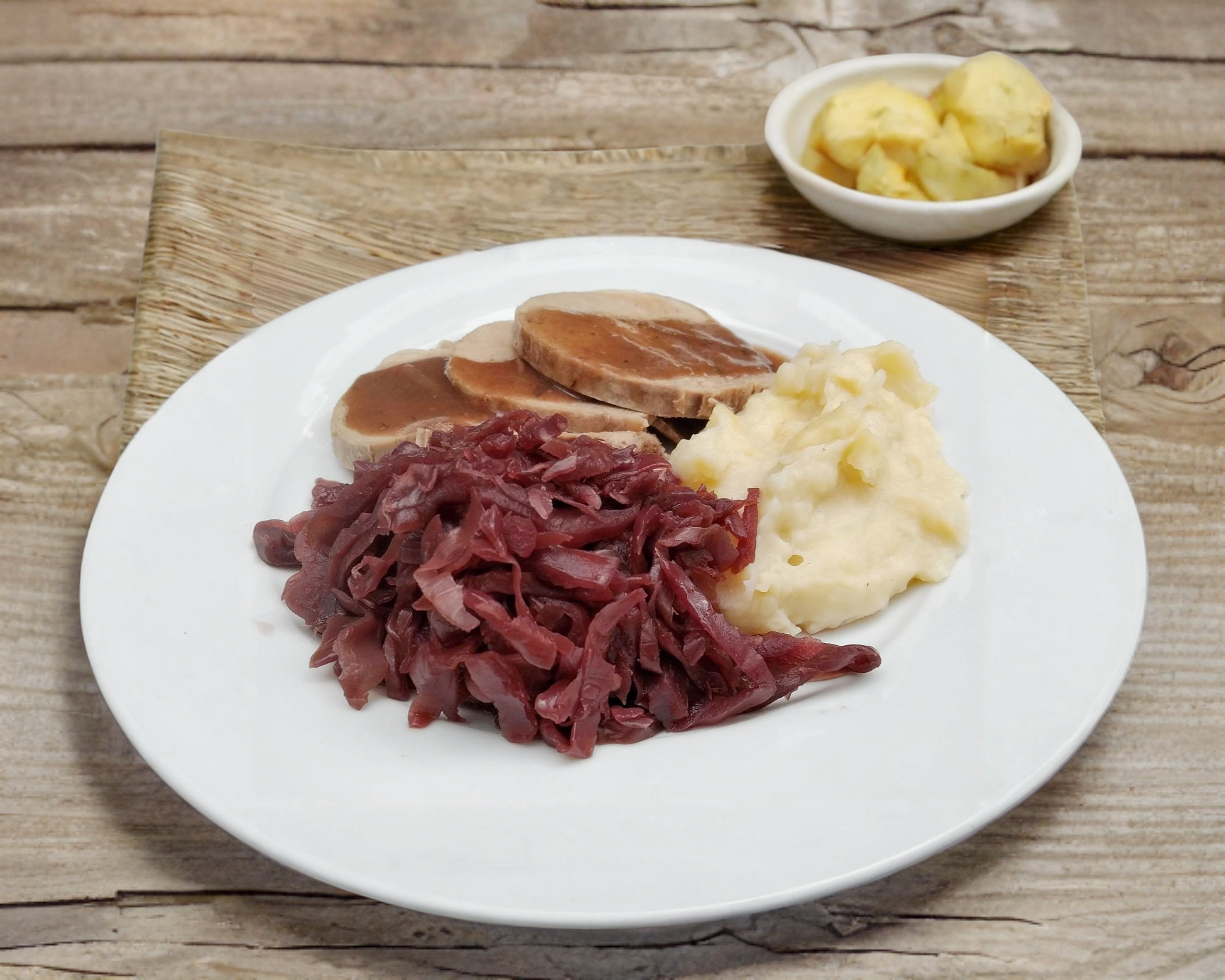 Acompañado de dos guarniciones a elegir; papas hervidas, papas fritas, arroz, pasta, semmel knödel, col agria, puré de papa, verduras al vapor, ensalada de papa, papa alemana, verduras a la mantequilla, papa al horno.