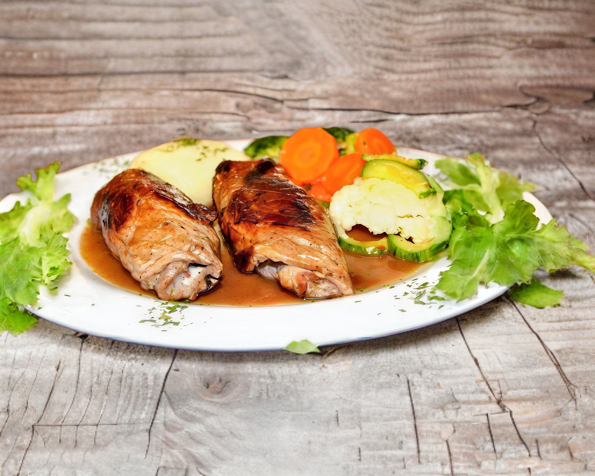 200 Grs., 2 sábanas de ternera rellenas de tocino, cebolla, mostaza y pepinillos acompañado de dos guarniciones a elegir: papas hervidas, papas fritas, arroz, pasta, semmel knödel, col agria, puré de papa, verduras al vapor, ensalada de papa, papa alemana, verduras a la mantequilla, papa al horno.
