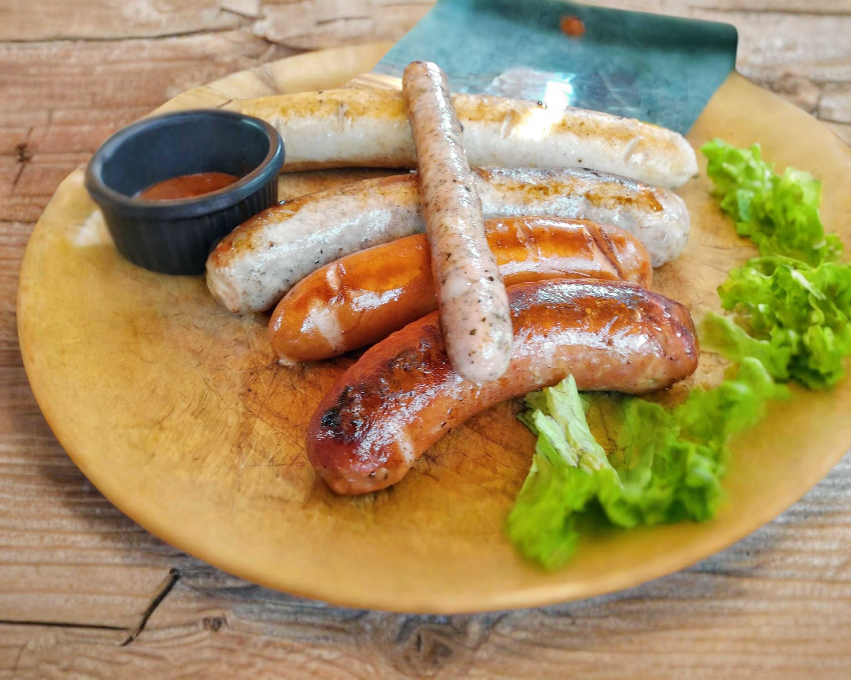 Variedad de salchichas alemanas, bratwurst, blanca de ternera, frankfurt, thuringer y ahumada, compañado de dos guarniciones a elegir: papas hervidas, papas fritas, arroz, pasta, semmel knödel, col agria, puré de papa, verduras al vapor, ensalada de papa, papa alemana, etc.