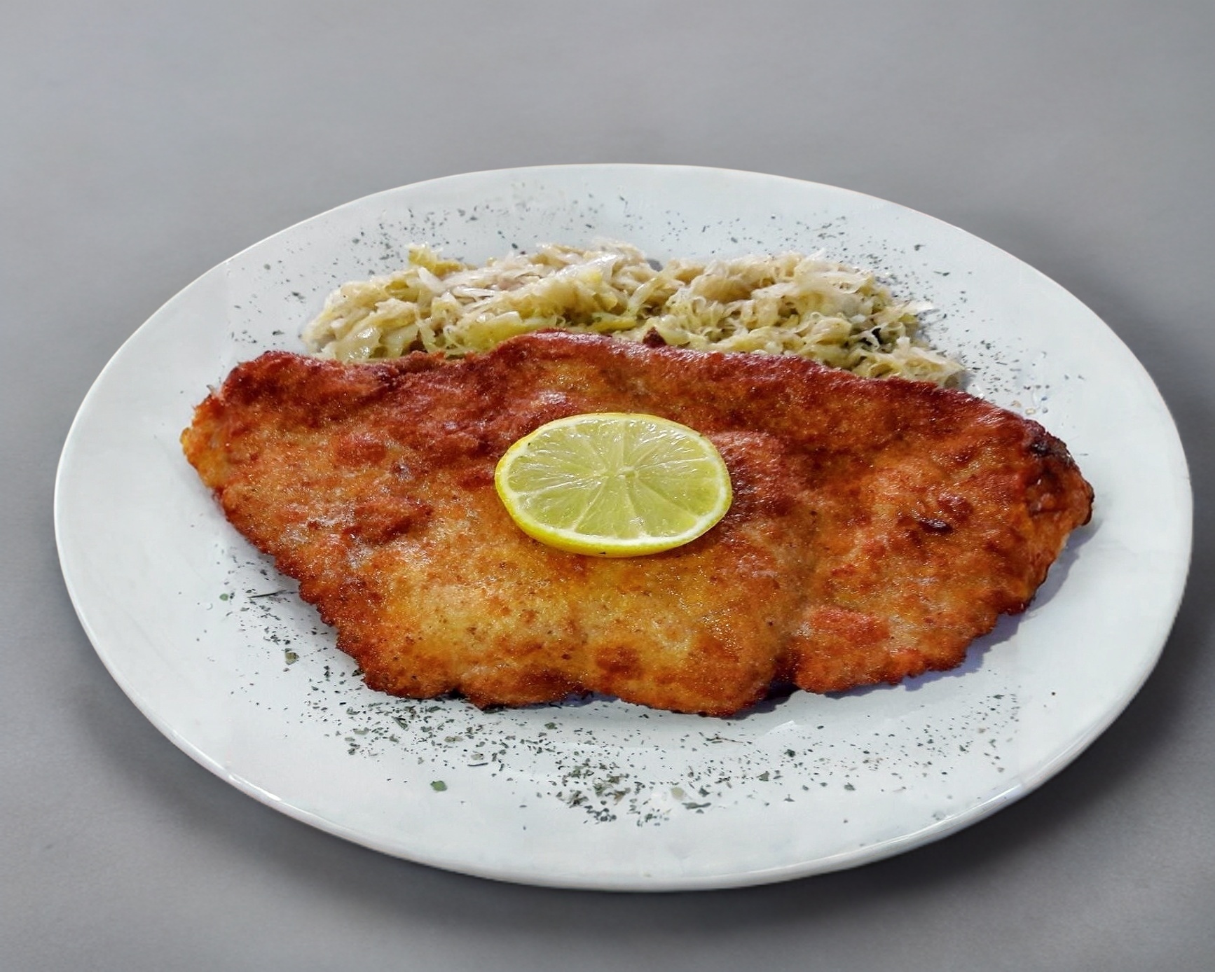 200 Grs. Carne de cerdo empanizada acompañada de dos guarniciones a elegir; Papas hervidas, Papas Fritas, Arroz, Pasta, Semmel Knödel, Col agria, Puré de papa, Verduras al vapor, Ensalada de papa, papa alemana, verduras a la mantequilla, papa al horno.