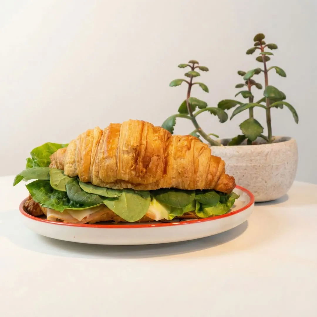 Croissant artesanal, hojaldrado y calientito, con jamón, queso bien derretido, lechuga, espinaca y jitomate. Suave, crujiente y delicioso. Añade picante al gusto.