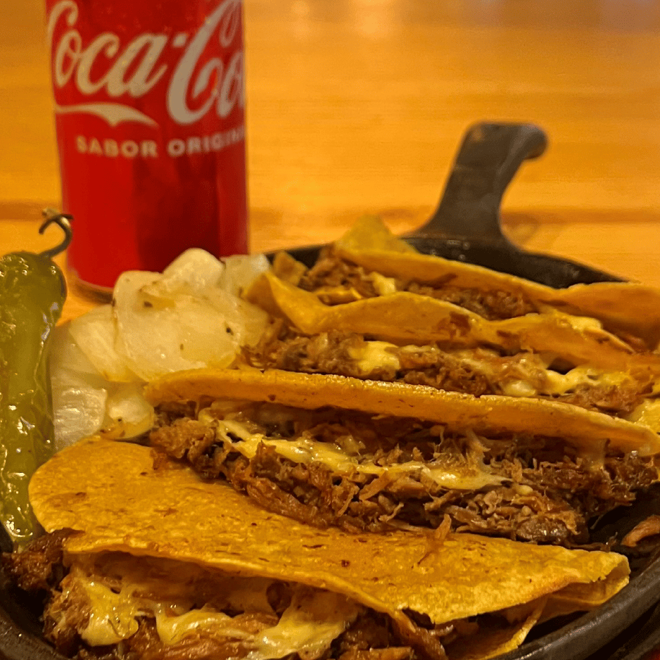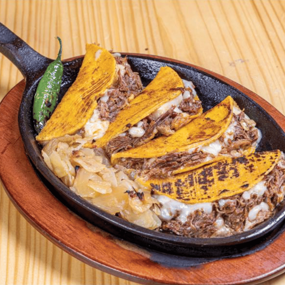 5 Tacos rellenos de sirloin en tortilla de harina acompañados de papa galeana a la ng.