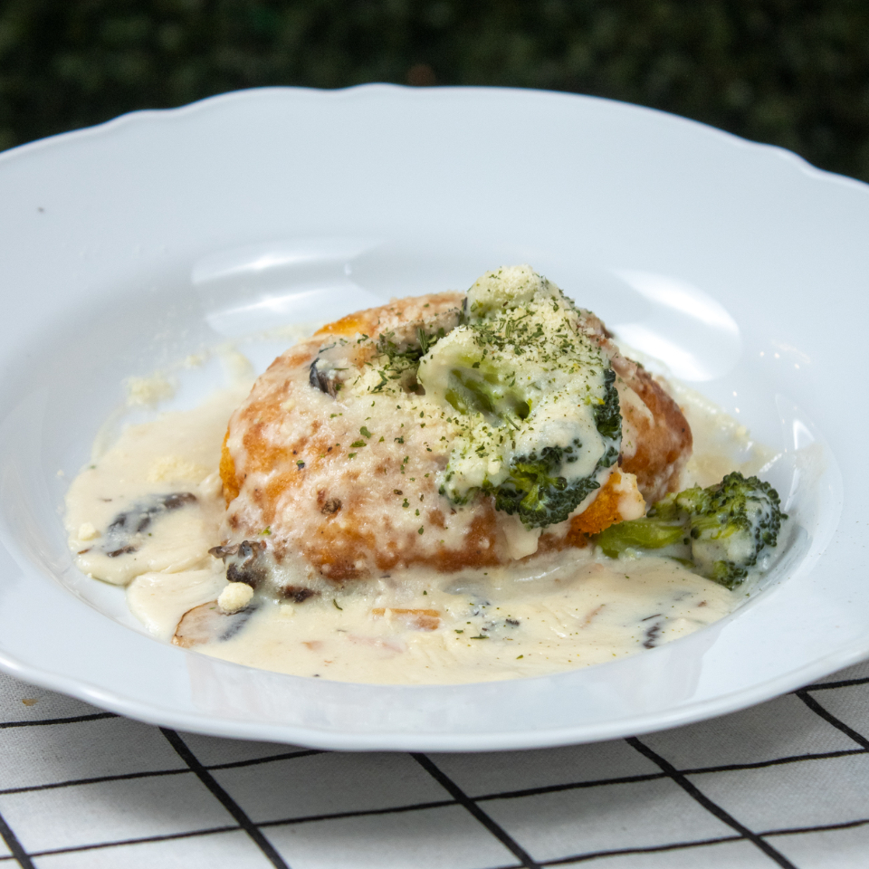 pechuga rellena de mozarella y jamon, bañado en salsa bechamel con champiñon y brocoli