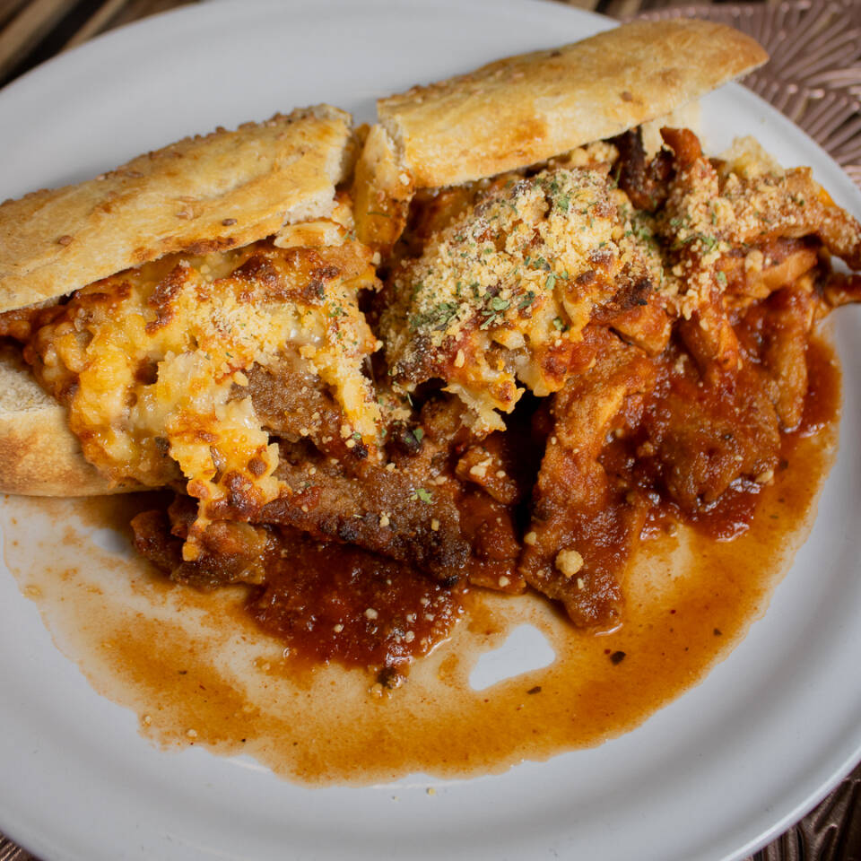 pan artesanal con milanesa de ternera bañada en salsa de la casa y gratinado con mezcla de quesos