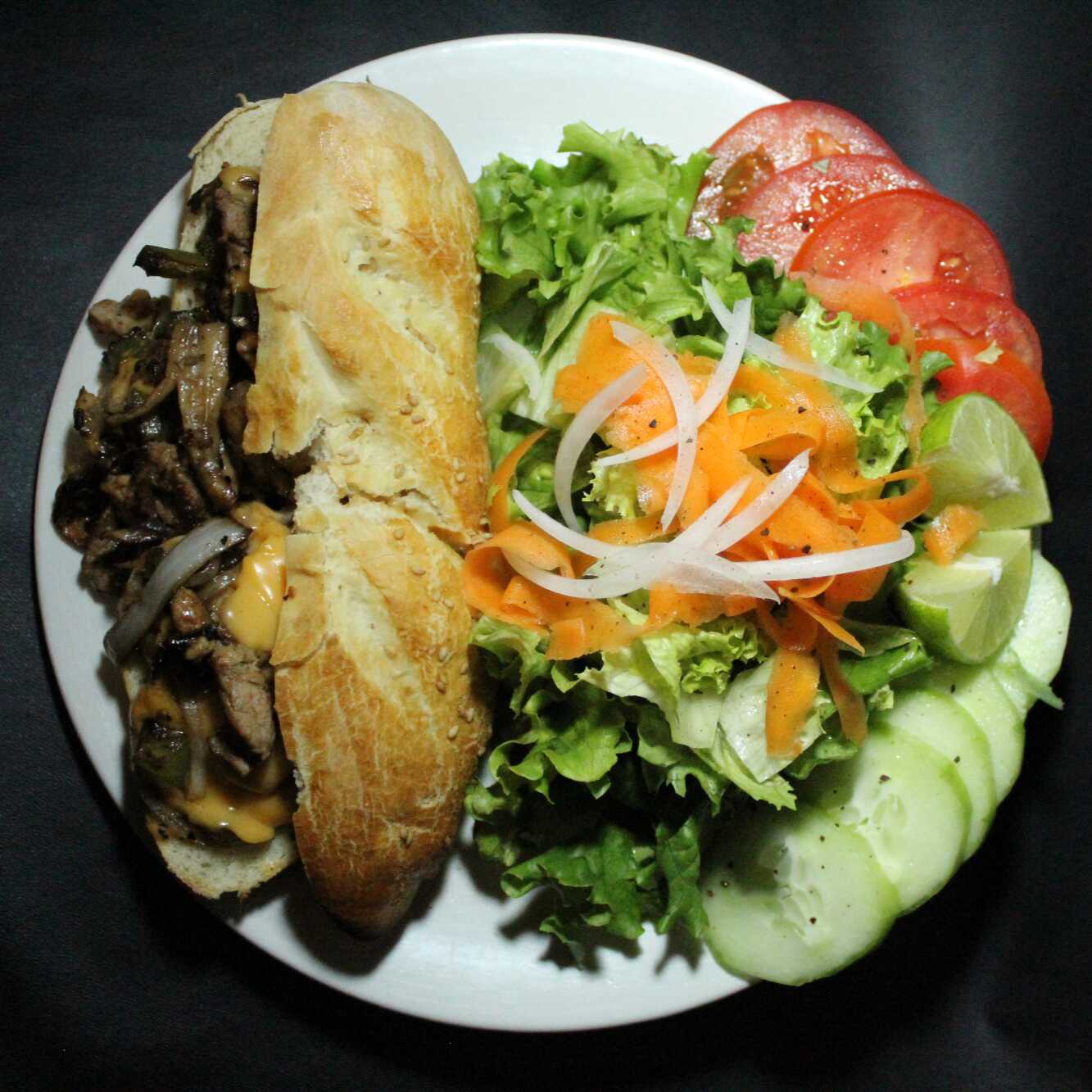 pan artesanal con bistec, tocino, champiñones, cebolla, morron y queso americano, acompañado de ensalada