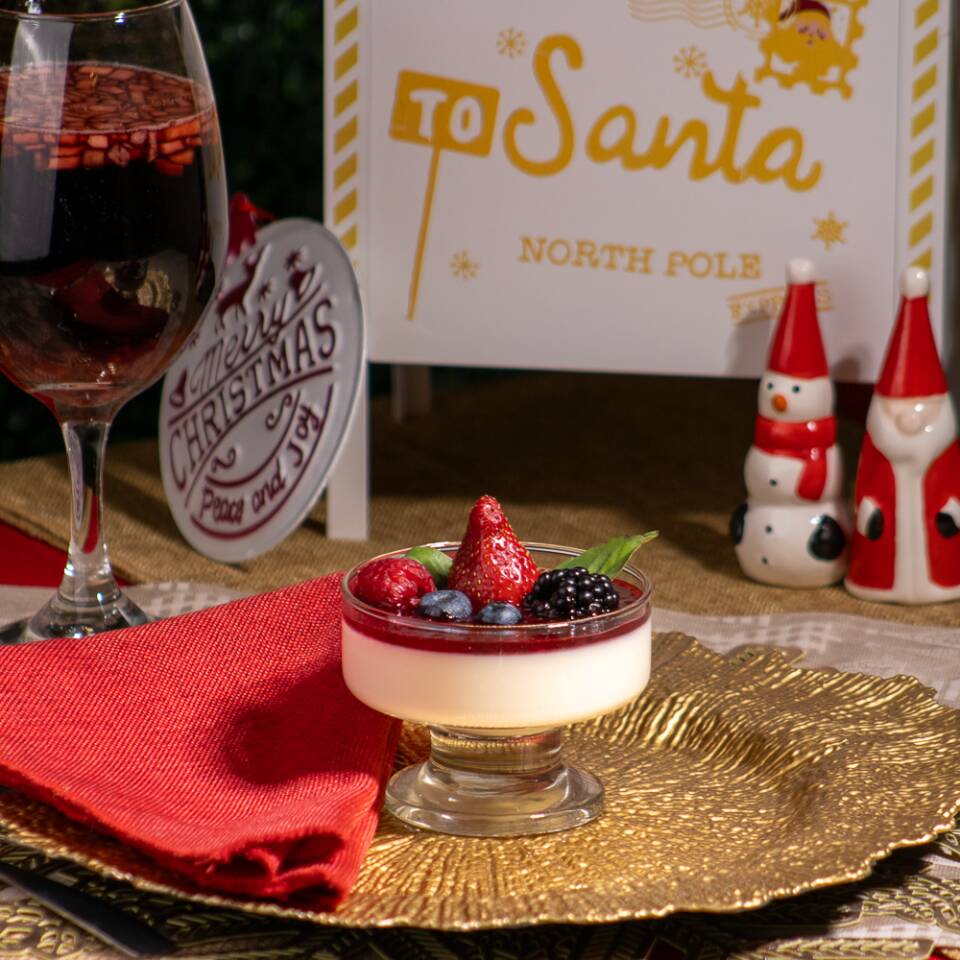 clasico postre italiano a base de nata con textura cremosa bañada en salsa de frutos rojos y trocitos de fruta