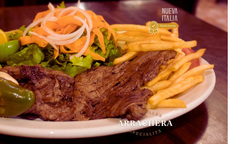 250g de arrachera, acompañado de ensalada, chiles toreados, cebolla y papas a la francesa