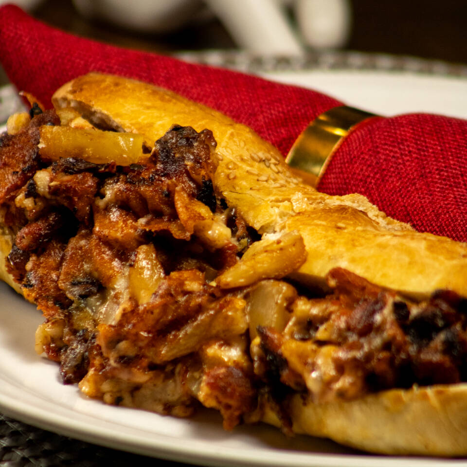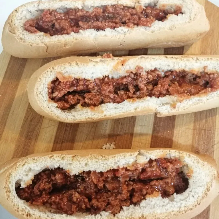 pan artesanal con milanesa de pollo, bañado en salsa de la casa y gratinado