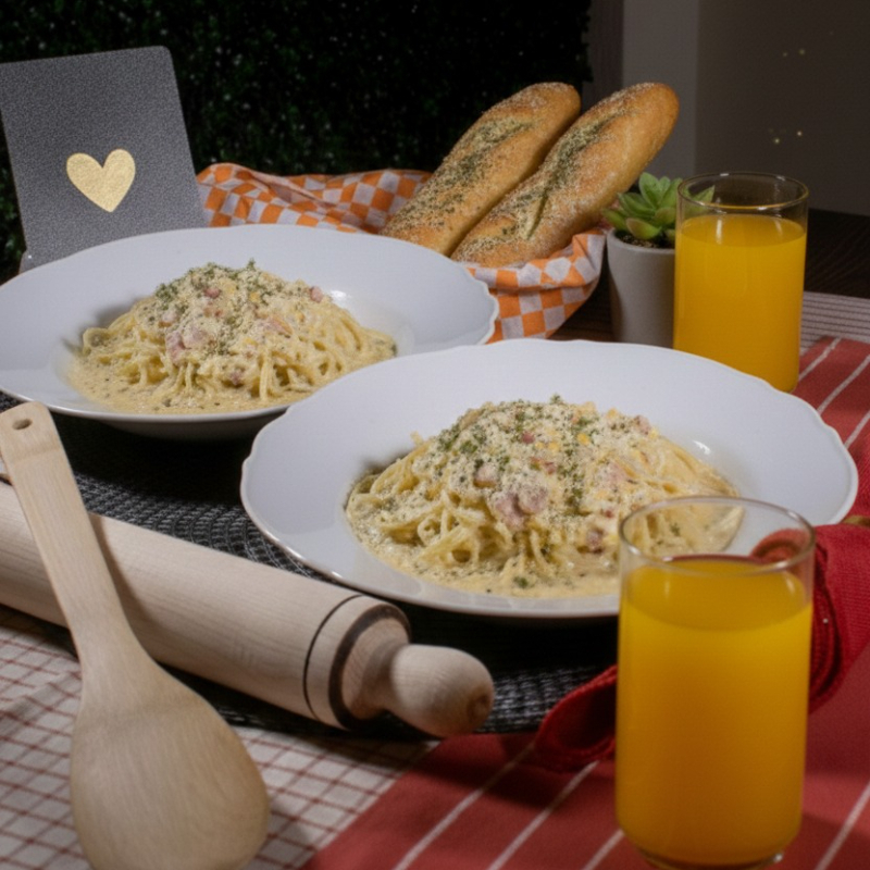 2 pastas a elegir ( Fettuccini alfredo clasico, Spaghetti al burro o spaghetti carbonara) + 2 bebidas (naranjada o limonada natural o mineral)