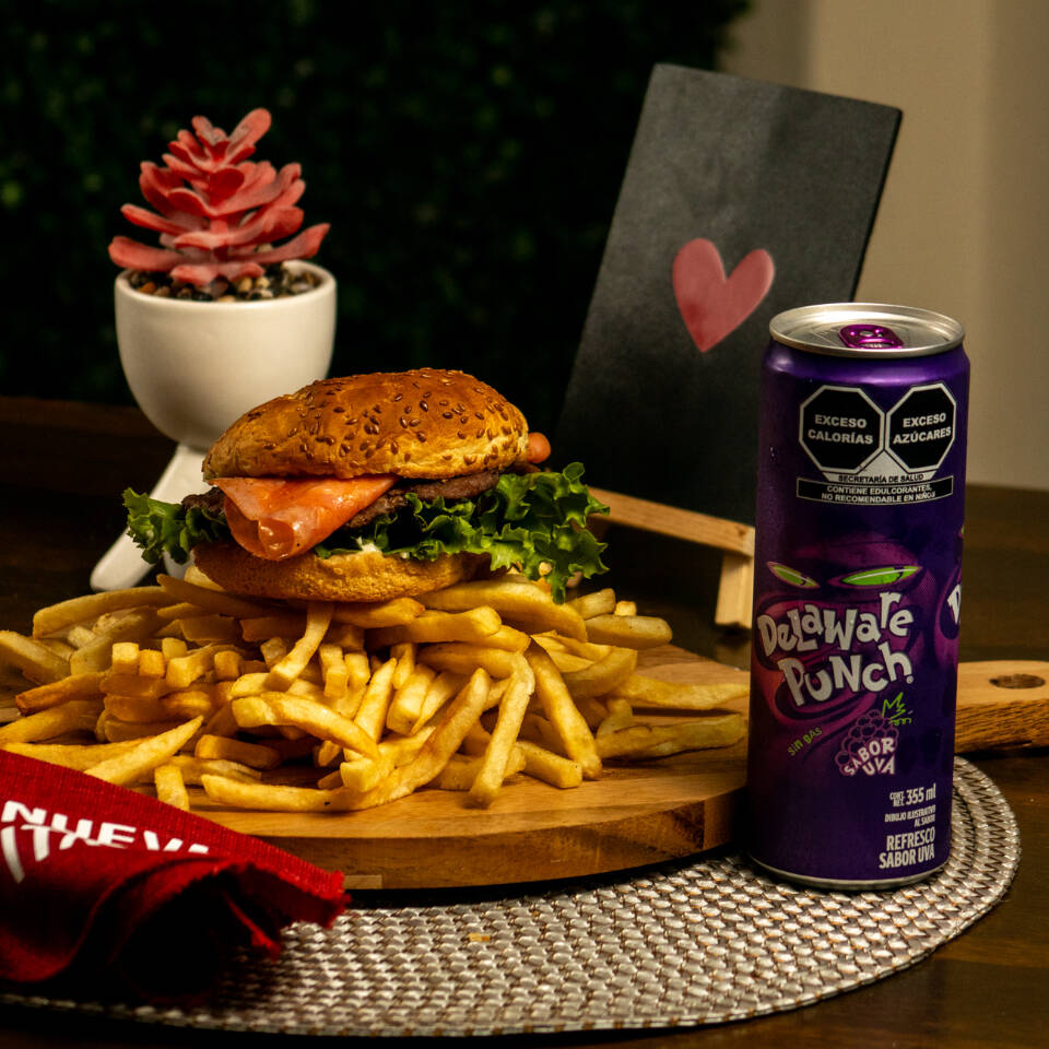 1 hamburguesa sencilla con papas + 1 refresco de 355 ml
