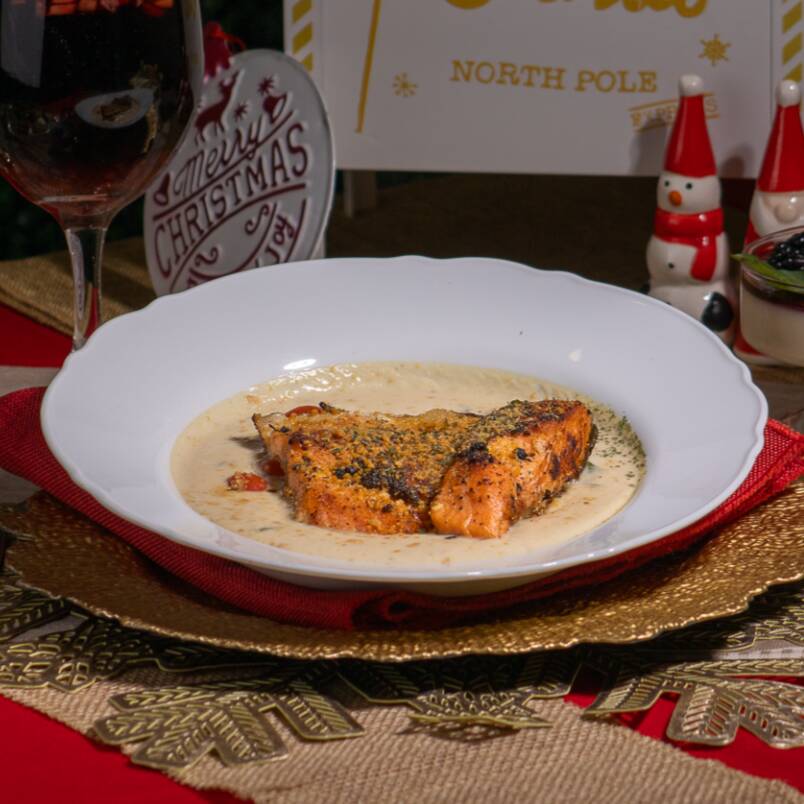 lomo de salmon sellado a la plancha y bañado en salsa bechamel