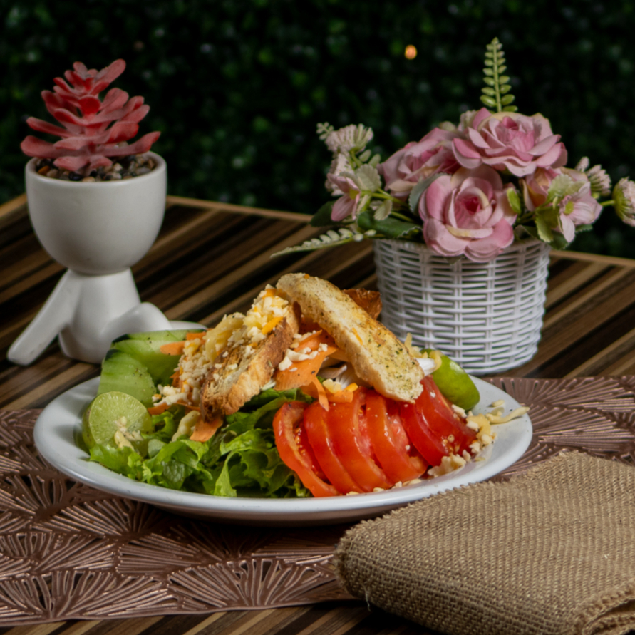 combinado de lechuga, jitomate, crutones, cebolla, pepino y mozarella
