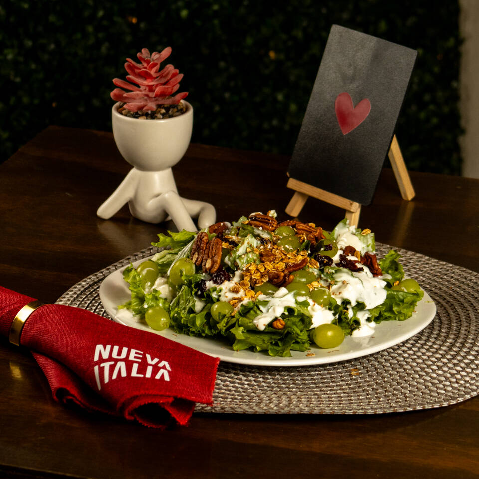 combinado de lechuga, uvas, granola, nuez, bañado en salsa de queso ricotta, arandanos y miel