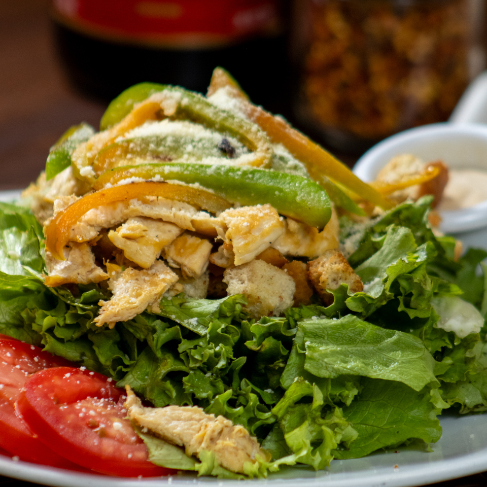 combinado de lechuga, crutones, pollo asado, queso parmesano y pimientos asados