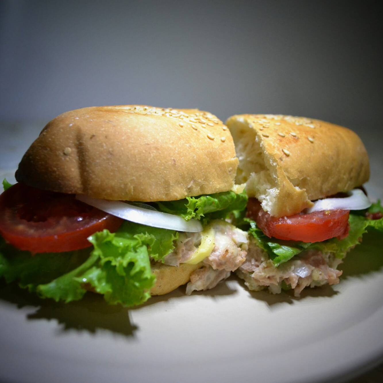 pan artesanal con atun preparado, lechuga, jitomate, cebolla y queso mozzarella